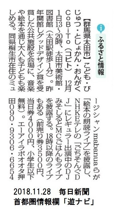 2018/11/28 18:50本日、毎日新聞社の「遊ナビ」にて、CoBiTOの掲載を頂きました。初開催ながら、計10以上のメディア様に掲載を頂き、本当に嬉しいです!チケットも現在100枚を超える枚数出ています!CAMPFIREは明日までとなりますので、お買い忘れ無いよう宜しくお願い致します。#cobito音楽 もっと見る