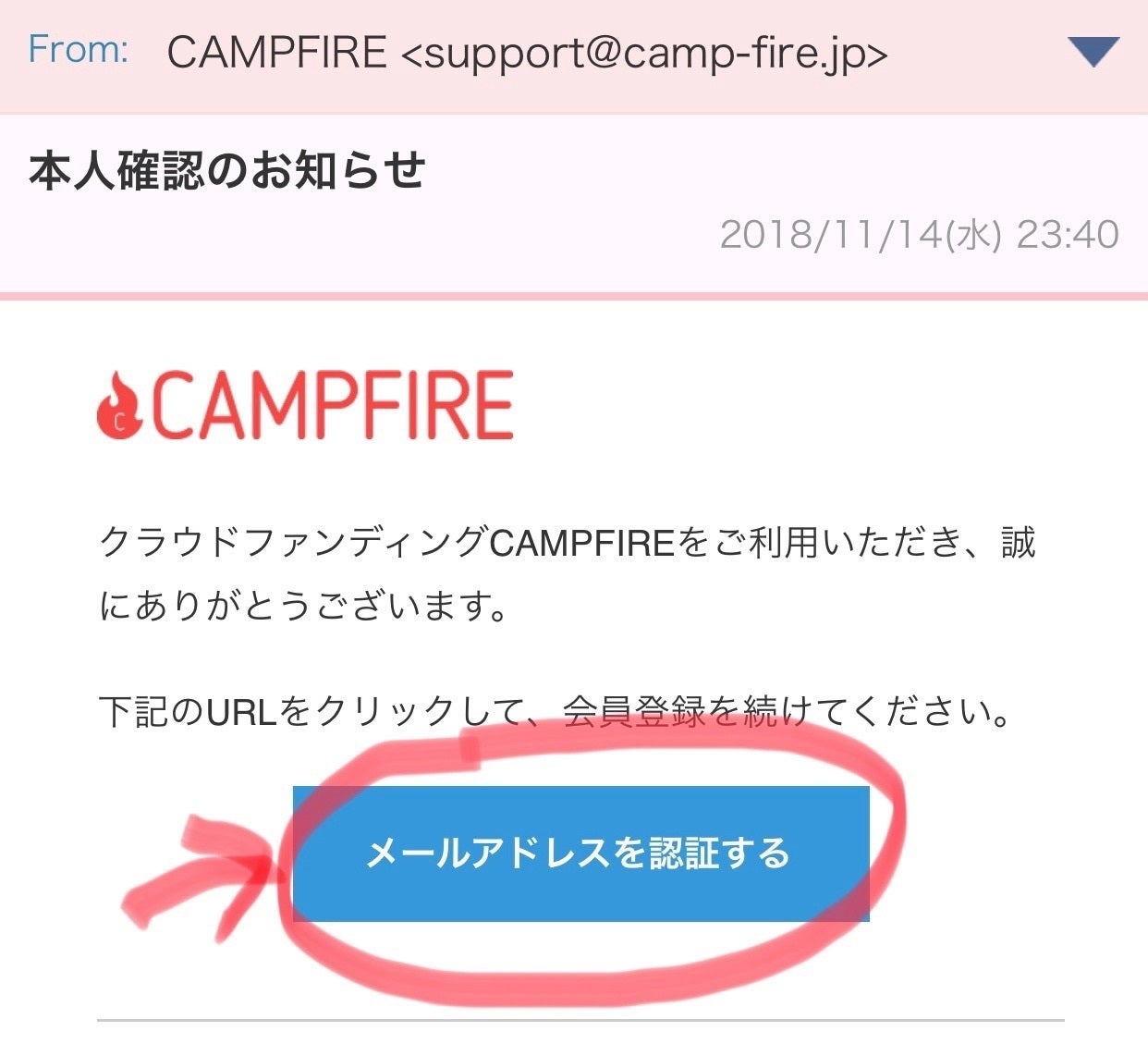 ④CAMPFIREから送られてきたメール内の「メールアドレスを保証する」をクリック