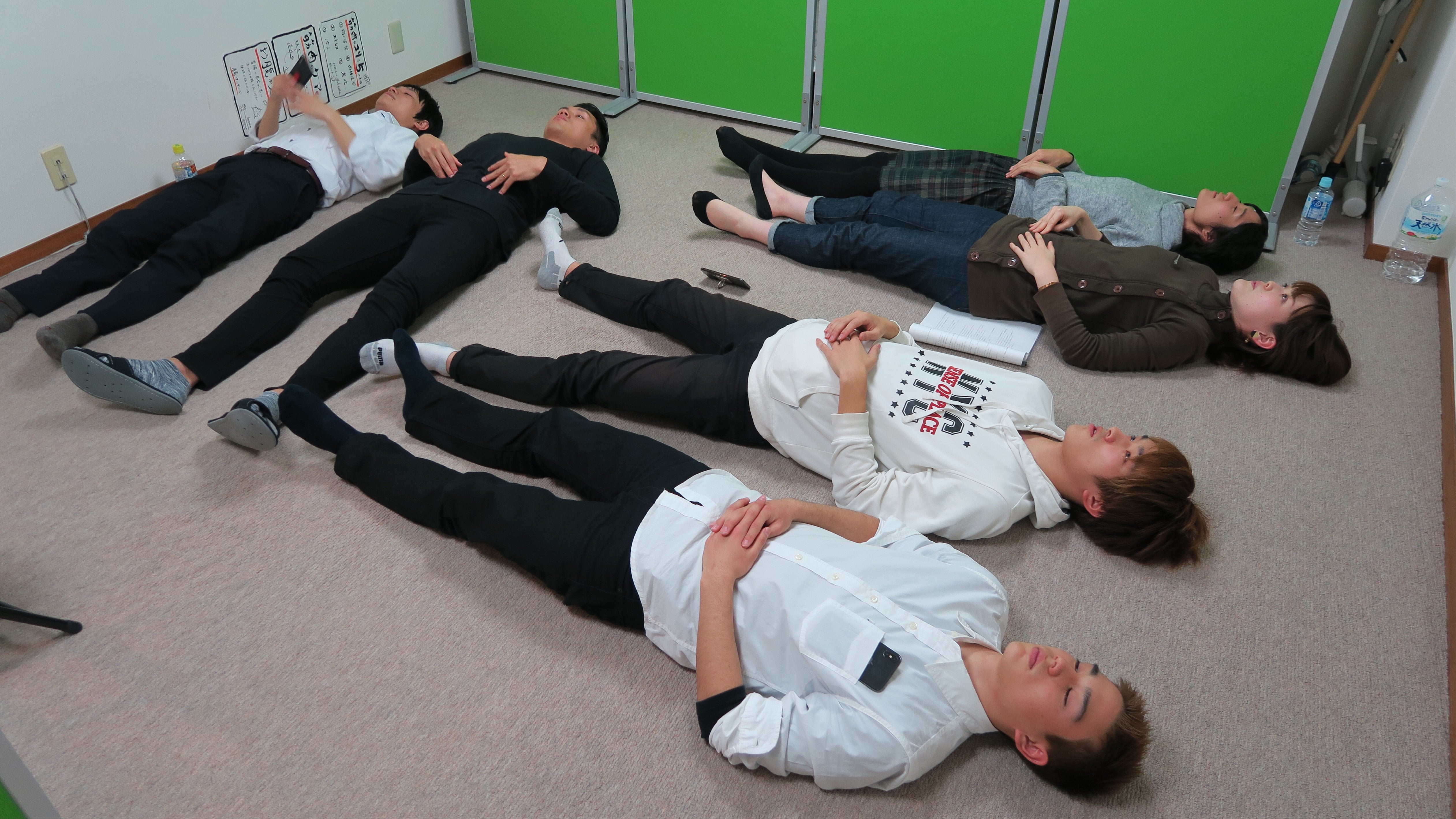 立っているより、仰向けに寝た方が腹式呼吸が出しやすくなります。なので、この状態で感覚を掴み、声出しをする、準備運動のような光景です♪