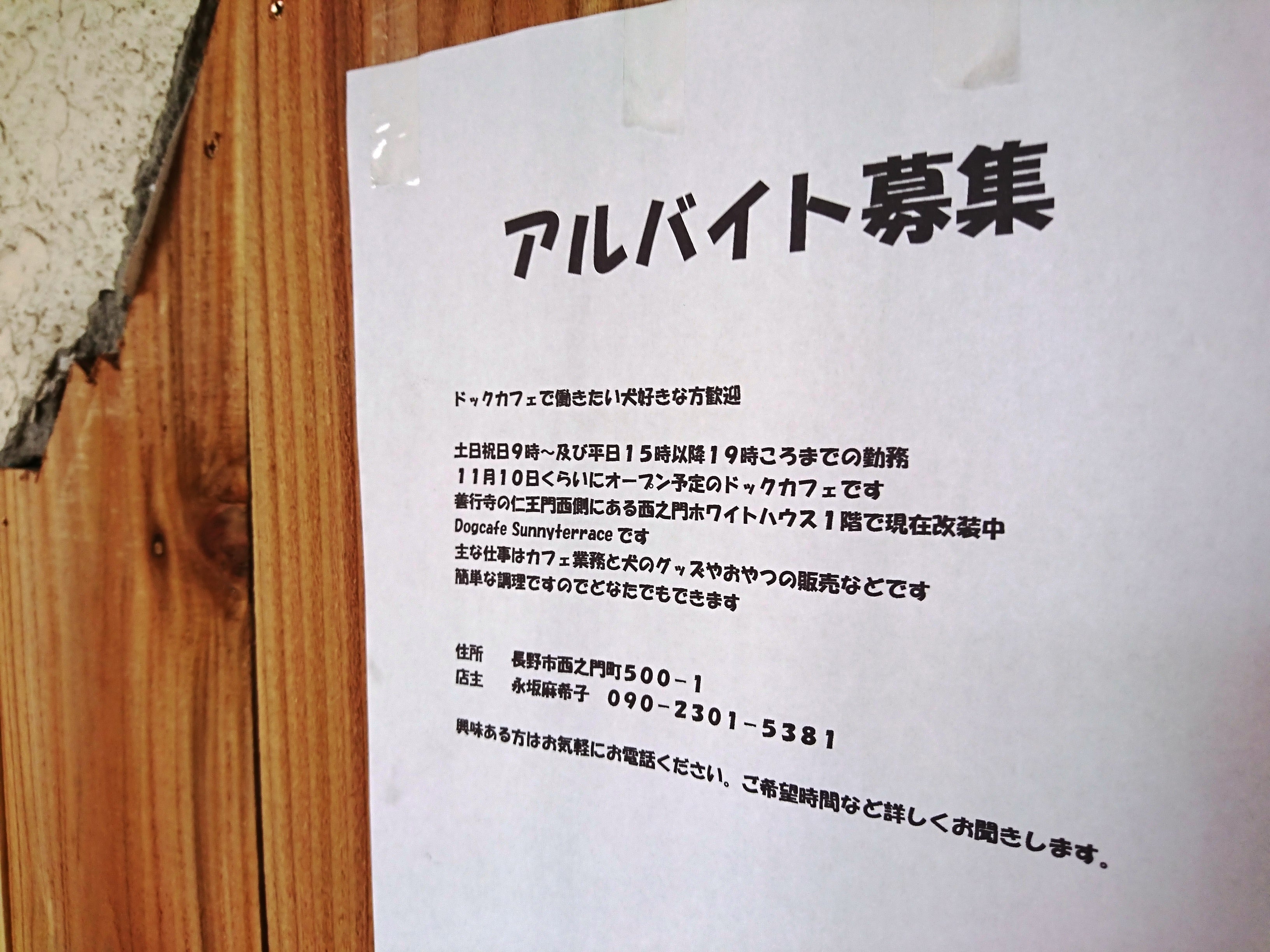 11月中のオープンに向けて着々と工事が進んでいるのが…。1Fのドックカフェ「Sunny Terrace」さんです。4年前この場所が、西之門針処だったとは思えないほどの変化をとげつつ、ここにきて急ピッチでみるみる店内がオープンで明るい雰囲気になってきました。西之門町はたった123mの通りですが、そこを通る地域の方、観光客が足を止めて「ここにもまた何かお店ができるんだね、楽しみ—!」なんて声が聞こえてきます。1Fのまさにテラス席になる西側の壁にはこんな張り紙が…。『ドックカフェで働きたい犬好きな方歓迎!!』犬好きの僕も手をあげたいくらいです(笑)オープンは予定より少しずれこんでいるようですが、リノベーションにはやってみないと予想外のこともたくさんありますから、みなで完成を楽しみに待ちましょう!!1Fの店主である永坂さんはとってもタフで、ユニークで、とても明るい方。僕らが2Fで作業をしていると、よく顔を出してくれます。建物全体の呼称を『西の門ホワイトハウス』にしたいことを相談した時も即答でOKをいただきました。『わたしにも何か協力できることがあれば・・・。』と2Fの僕らのドタバタ劇場を一緒に楽しんでくださっています。まさに、永坂さんがこのホワイトハウス1Fに入ってくださったことで、声をかけていただき動き出したこのプロジェクトです。本当にありがたいことですし、僕ら2Fのシェアオフィスのメンバーも1Fの賑わいが、とっても張り合いですし、早くカフェで外の門前の空気を感じながらお茶をいただきたいです。1Fで働いてみたい方、まずは永坂さんまでお電話くださいね!!呼びかけ人(2F・3F) 箱山 正一 拝 -------------------------------------------------------------------------------------【支援金に関するご案内】みなさんのご支援がこの建物の2~3Fの改装費にあてられます。3000円から(金額設定自由)できるので、リターン(返礼品)選びも楽しみながら、ご支援をよろしくお願いいたします【期限:11月28日(水)まで】「このクラウドファンディングの仕組みがわかりずらい」「クレジットカードでの支払いが苦手」「リターンなんていらないよ!」という方には直接、口座振り込みでも、直接現金でもかまいません。その際には、お振込先をお伝えしたり、場合によっては直接お伺いいたしますので、【お名前】【ご住所】【連絡先】【支援金額】を明記のうえまずはメール[nishinomon.whitehouse@gmail.com]箱山までご連絡ください。追って、詳細ご案内申し上げます。-------------------------------------------------------------------------------------いよいよ期限まであと・・・12日!!