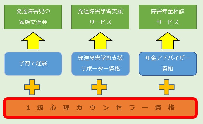 (緑色:事業・サービス、青色:現状の資格等、オレンジ:1級心理カウンセラー資格)