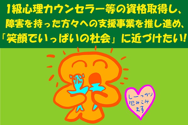 障害者サポートを積極的かつ円滑にする社会貢献の架け橋のような存在でありたいとの思いがあります。取得には時間も費用もかかりますが、意思は固いです。「発達障害学習支援サポーターであり、心理カウンセラー」の、肩書きに負けない、心は温かく、熱い支援者になります。