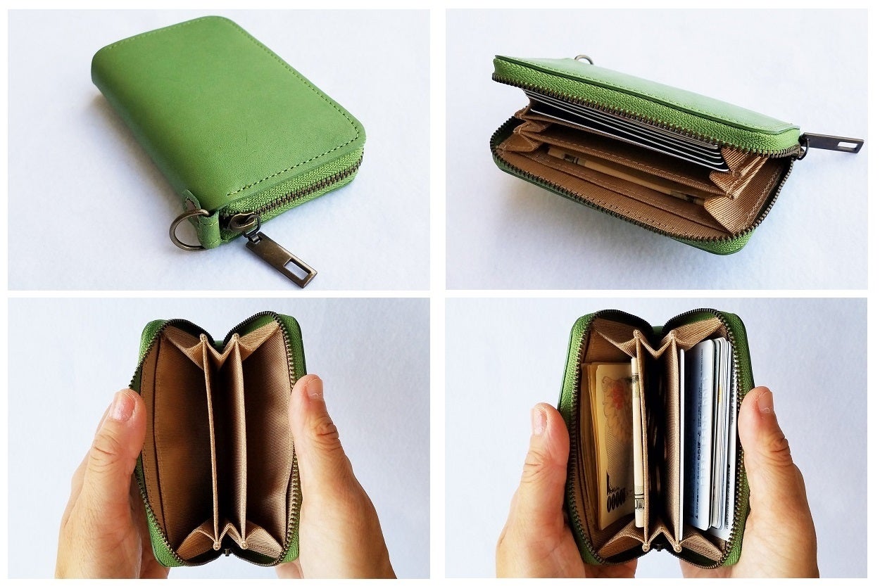 手のひらサイズのラウンドファスナー式財布です。いわば小回りの効くセカンドカーやスクーターのような存在です。上着のポケットやミニサイズバッグにも入る小ささが最大の魅力ですが、クレジットカード類よりもワンサイズ大きいショップカードや名刺も収納できるのがミソ。内側は5つのポケットに仕切られているので、たとえば左からカードにレシート、小銭、お札、名刺などと、うまく棲み分けができるのも特長です。またDカンが付いていますのでキーホルダーなどを装着できます。使い込むほどに自分だけの艶や色味に変化していく《エイジング効果》もお楽しみ下さい。