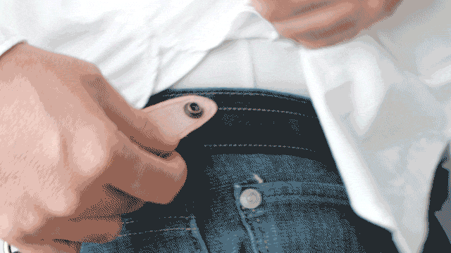 「出し入れ簡単」②:金具の吊り元を、真ん中でなく背面にしたことで、装着したときに取り出し口が人間の動作に適した斜め前方になるように設計しました。これは侍の抜刀やガンホルダーを参考にしました。