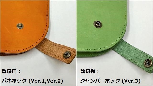 ①ver.1、ver.2をお買い求めいただいた数名の方から、「スライド留め具が何か引っかかって外れてしまう、紛失してしまった。パーツで買えますか?」という声をいただきました。そこで一般のバネホックからジャンパーホックに変更改良しました。