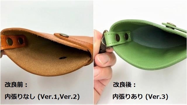 ②こちらは特にver.2をお買い求めの数名の方から、「スマホを頻繁に出し入れするため、開口部の内側が汚れが目立つ、皮革繊維がもろもろになる。」という声をいただきました。そこで開口部から底部に向かって3分の1程度、内側にも革を張り付けるように変更改良しました。
