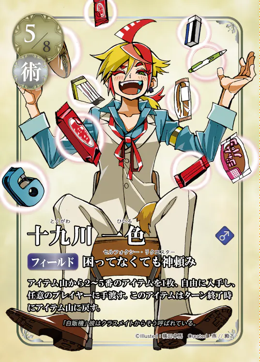 4種類のアイテムを自在に入手できるため、事実上、4種類のバフ効果を使い分けられる強能力です。だいぶ前のめりな性能にしているため、今日のダンゲロス会(東中野ディアシュピール)で大丈夫かどうかテスト予定です。この能力はちょっと強すぎるかもしれんね!
