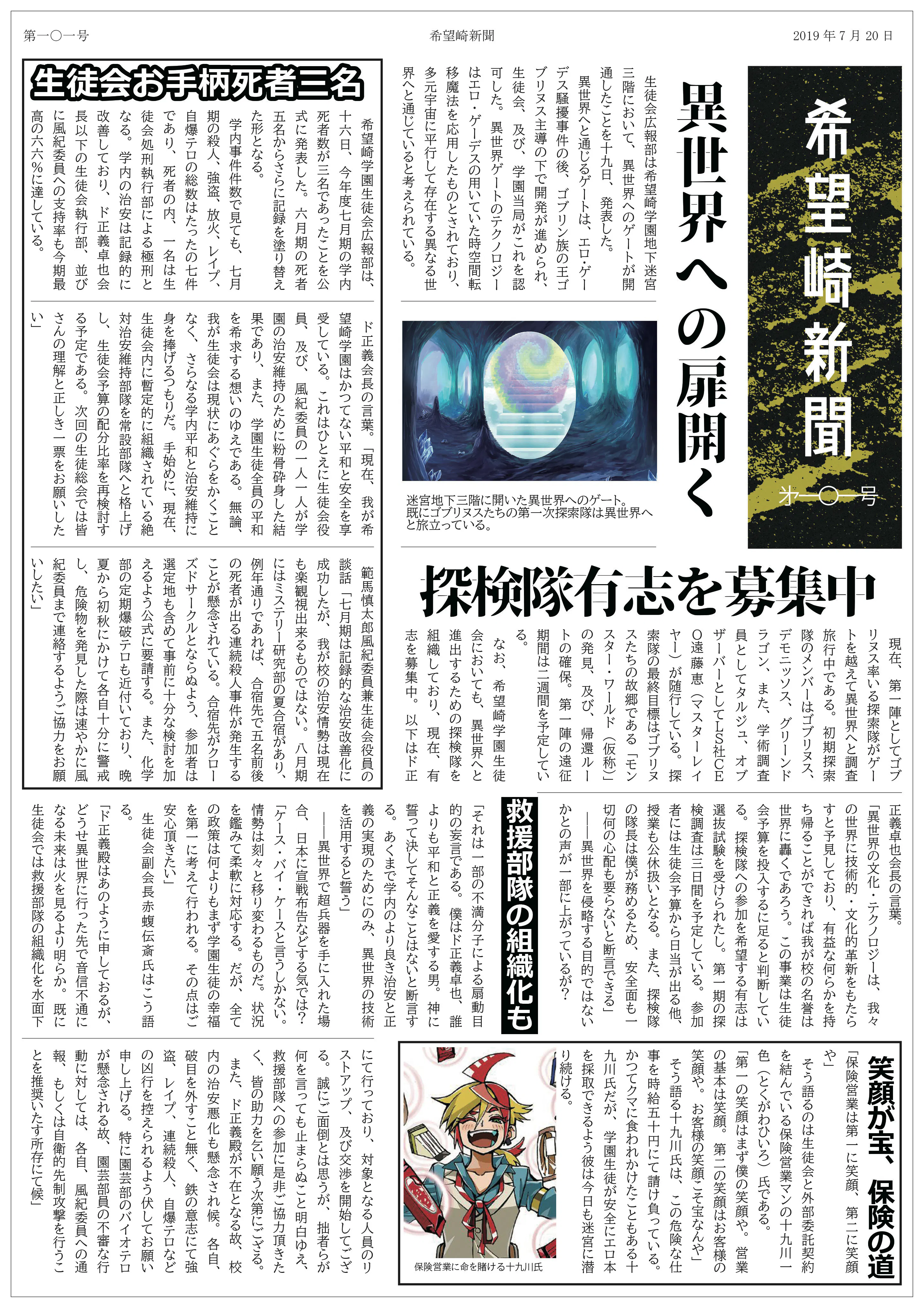 「#希望崎学園大進撃」で交わされた情報は不定期発行の「希望崎新聞」にて取り上げられ、皆さんの活躍が記名(ツイッター名)でアーカイブされていきます。