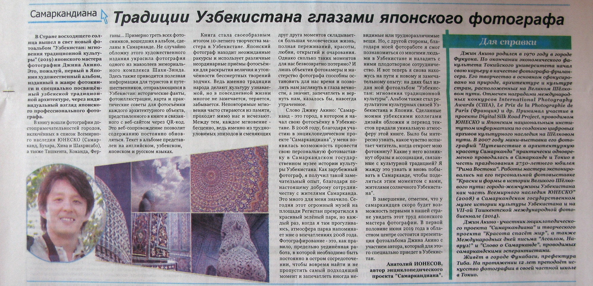 ウズベキスタンの週刊誌「Lady Weekly」(2019年5月30日)にて、「TRADITIONAL MOMENT IN UZBEKISTAN(ウズベキスタン・伝統の瞬間)」出版の件、と秋野の写真家としての活動について報道されました。
