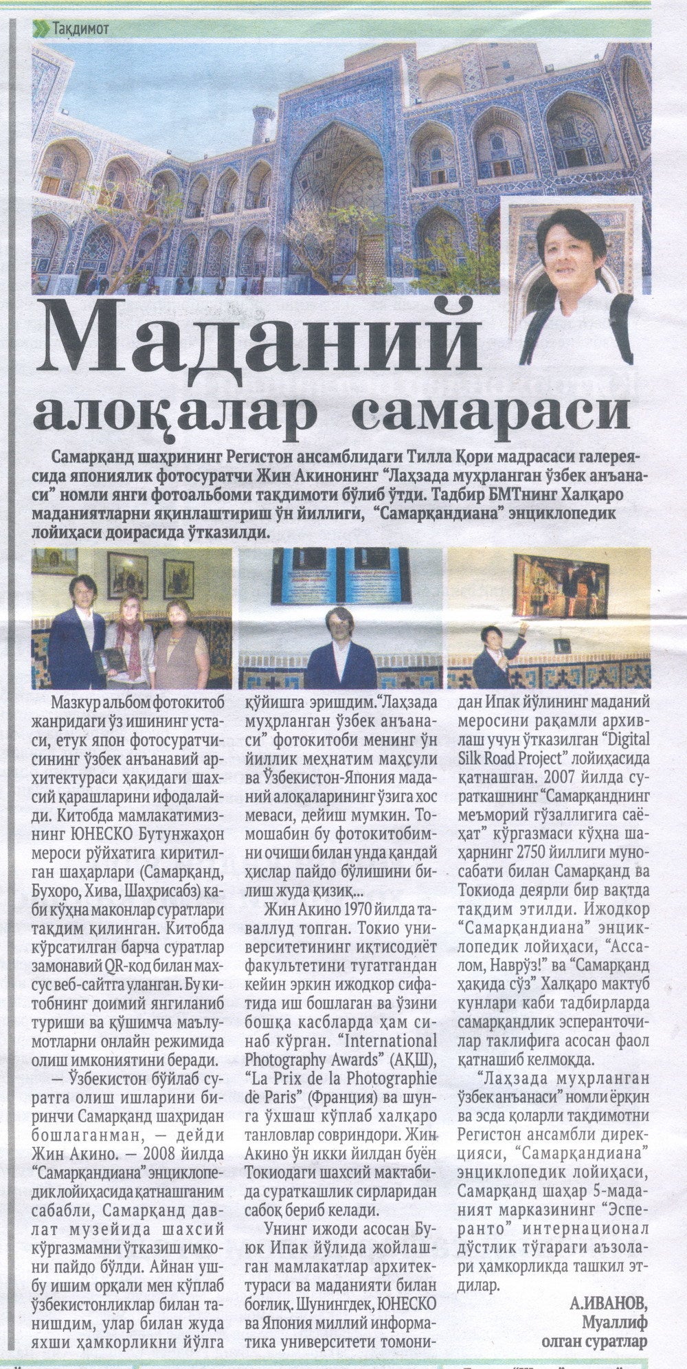 サマルカンドの世界遺産レギスタンで開催された写真集の出版記念セレモニーの様子が、ウズベキスタンの全国ネットSevimli TVチャンネルの夜のニュース番組"Zamon"で報道されました。