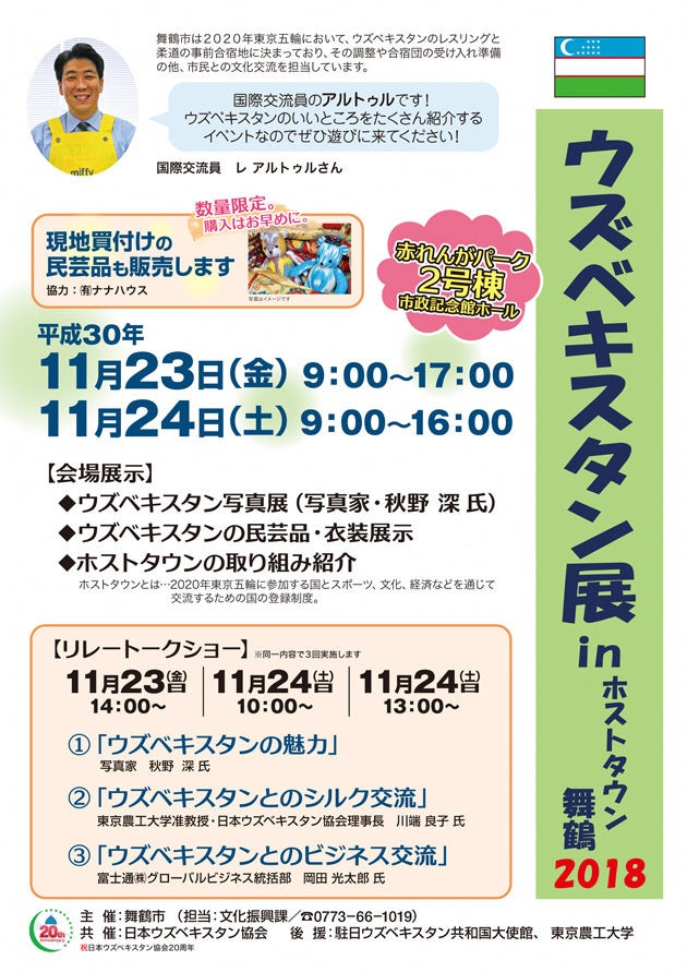 2020東京オリンピックでウズベキスタンのホストタウンとなる京都府舞鶴市で開催される「ウズベキスタン展 in ホストタウン舞鶴2018」にて、写真家・秋野深による写真展とトークショーが開催されます。 日程:2018年11月23日(金)-24日(土)会場:赤レンガパーク2号棟市政記念館ホール ★ウズベキスタン写真展 ★トークショー「ウズベキスタンの魅力」(同一内容で3回実施) 11/23(金)14:00-11/24(土)10:00-11/24(土)13:00- その他、「ウズベキスタンとのシルク交流」(東京農工大准教授・川端良子氏)、「ウズベキスタンとのビジネス交流」(富士通株式会社・岡田光太郎氏)も登壇されます。