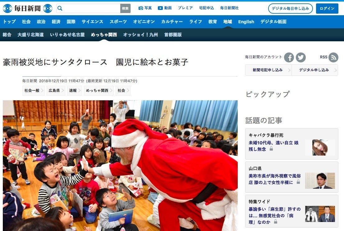 西日本豪雨で被災した広島の保育園を訪問した様子が毎日新聞に掲載されました。https://mainichi.jp/articles/20181219/k00/00m/040/092000c※補足:チャリティーサンタでは、12/24クリスマスイブに訪問するのが活動のメインですが、今回のような施設や病院などの都合によっては、イブより前の訪問にもできる限りサンタさんは対応しています。