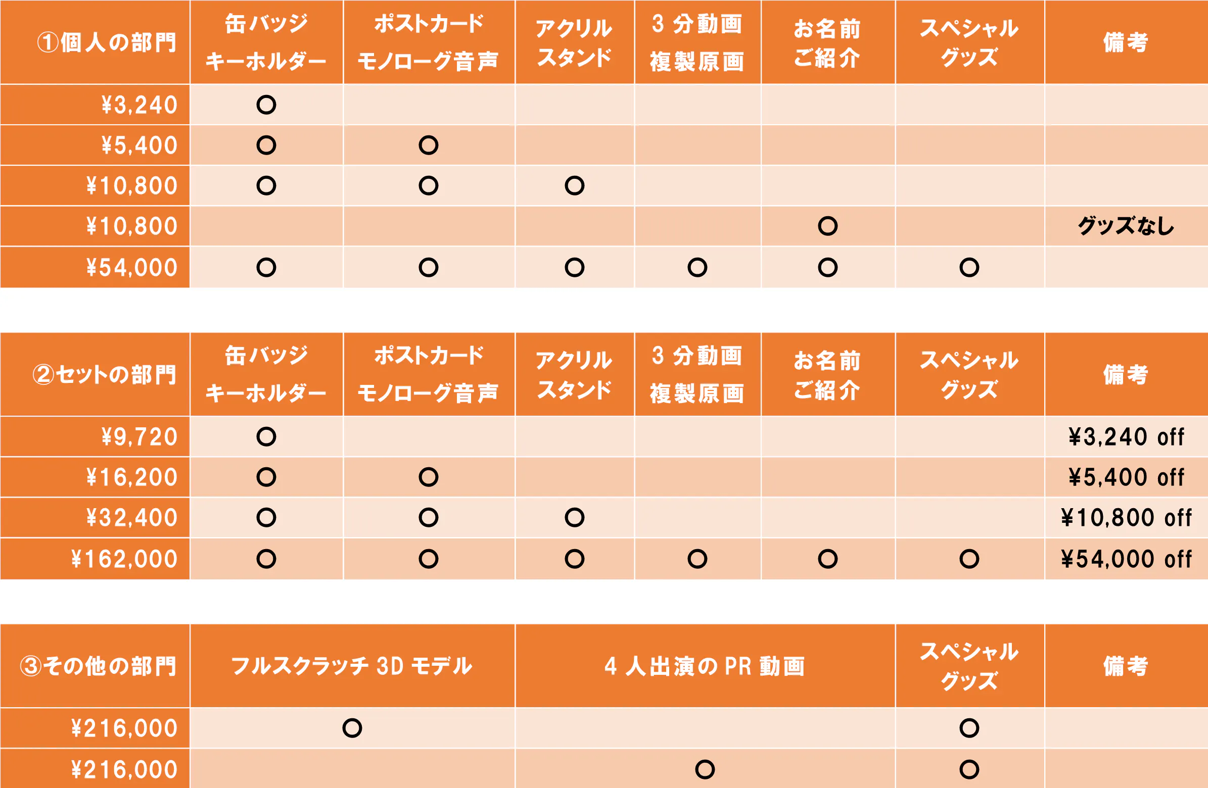 ②セットの部門:4人全員のグッズのリターン(1人分お得!)