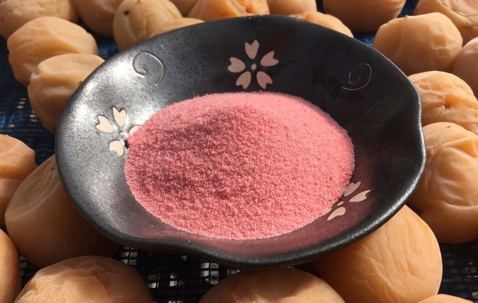 梅を塩漬けしたときに複製される梅酢を活用して出来た酸味のあるお塩です。色合いがきれいなだけでなく、梅のエキスが溶け込んでいるので肉料理や油料理への相性が良く、クエン酸たっぷりで健康にとても良いです。