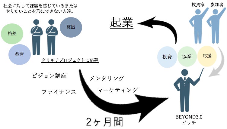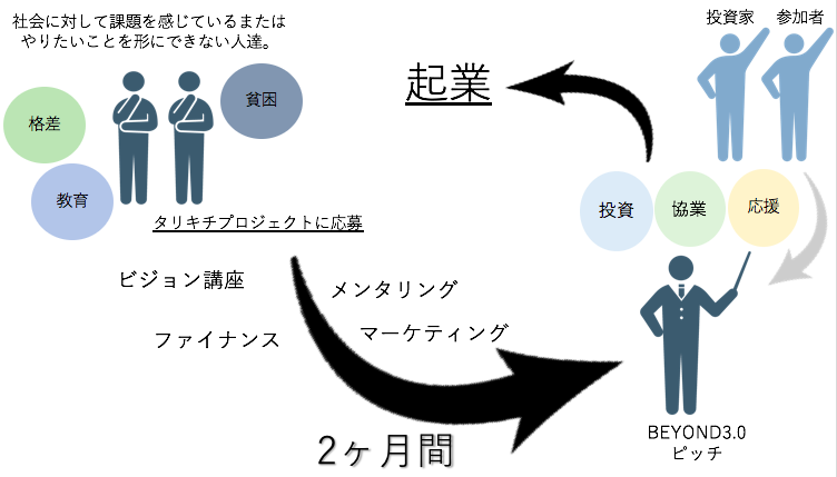 社会に対して課題意識を持った25歳以下の若者が2ヶ月間かけて事業立案からプロトタイピングまで行い、ブラッシュアップするインキュベーションプログラム「タリキチプロジェクト」のプランをこの場で提案します。
