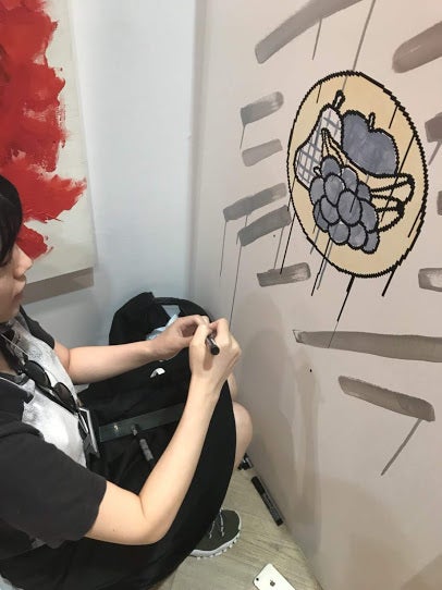 ほぼ全てキャンバスに手描きで描いており、画材は、スプレー・アクリル絵の具・ポスカなどを使用して制作し、シルクスクリーンを使っているものもあります。