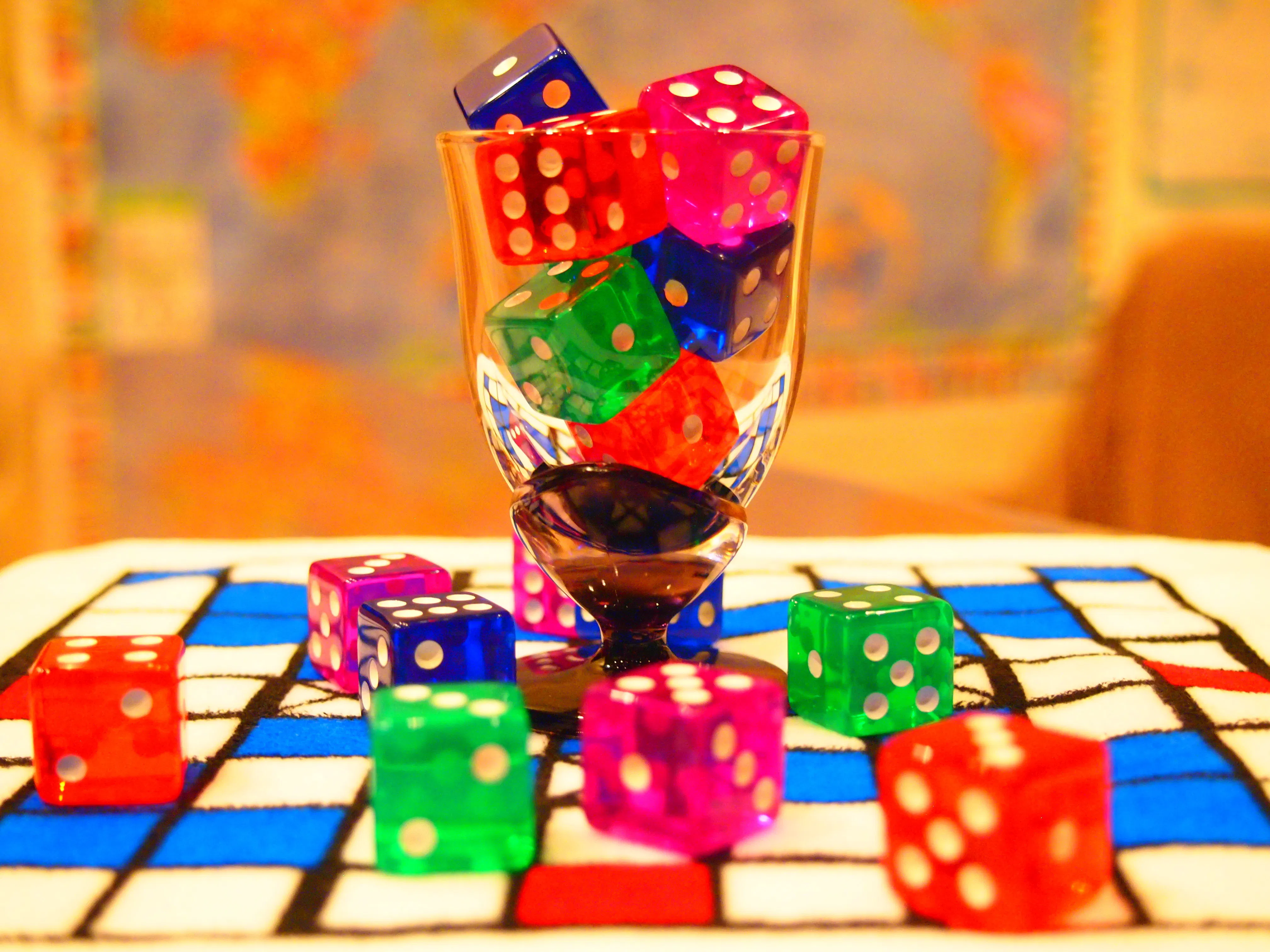 ただし、写真のように、カラフルなクリアダイスでご提供いたします。