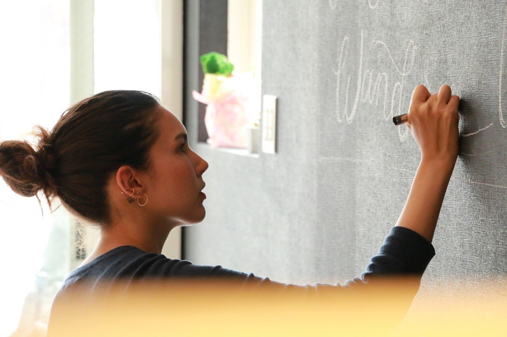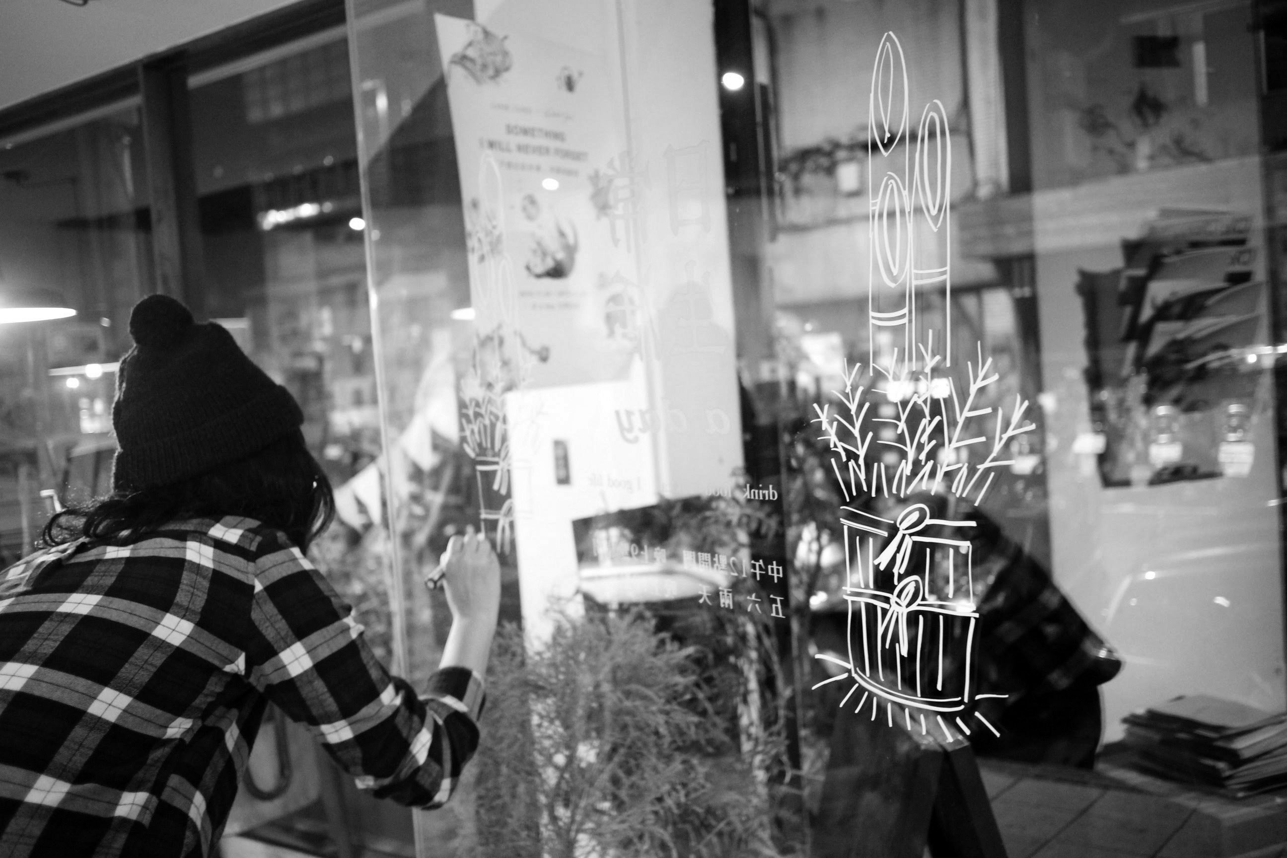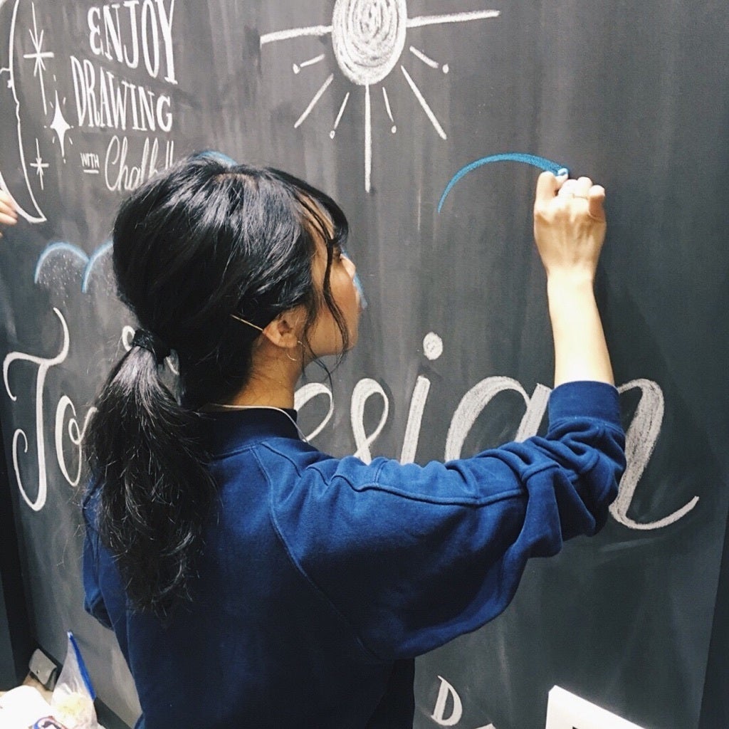 カフェでのアルバイト時代に描いていたおすすめメニューの黒板が評判となり、バイトなのに出張で描きに行ったり、他社のカフェに描いたりしているうちに独立。今ではチョークだけではなく万年筆やその他いろんな画材を使って、壁面の作品制作から企業の広告、CM、ロゴ制作やブランディング、雑誌メディア媒体へのイラストや挿絵の制作など本当に幅広く仕事をさせていただいています。