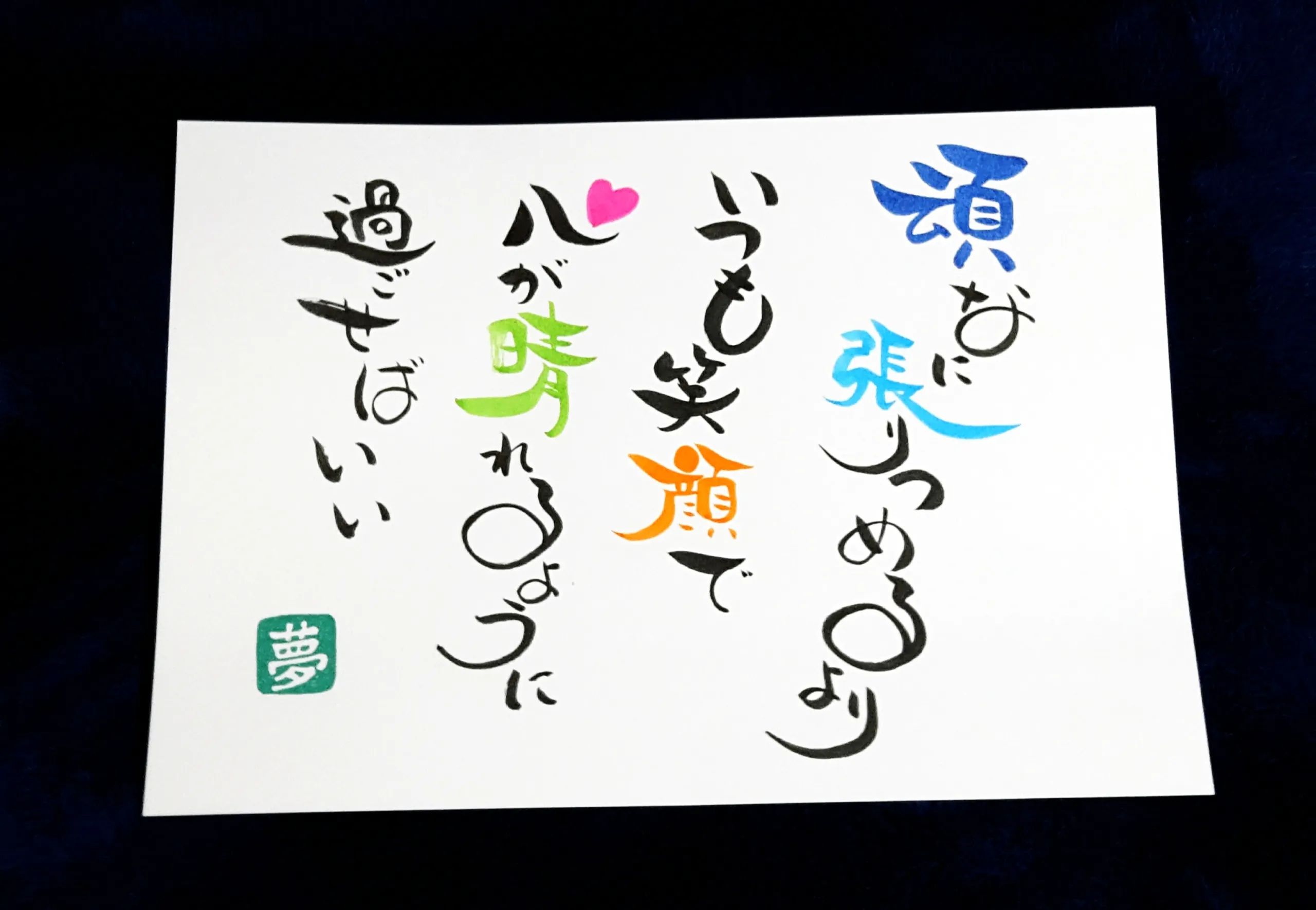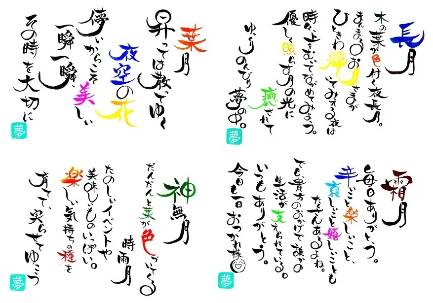 「一筆入魂」を信念とし、詩の中にお名前を織り交ぜた「お名前ポエム」や創作詩を中心に見る人を「ほっこり」させる、時には元気づけ、笑顔にする。そんな作品を書いています。