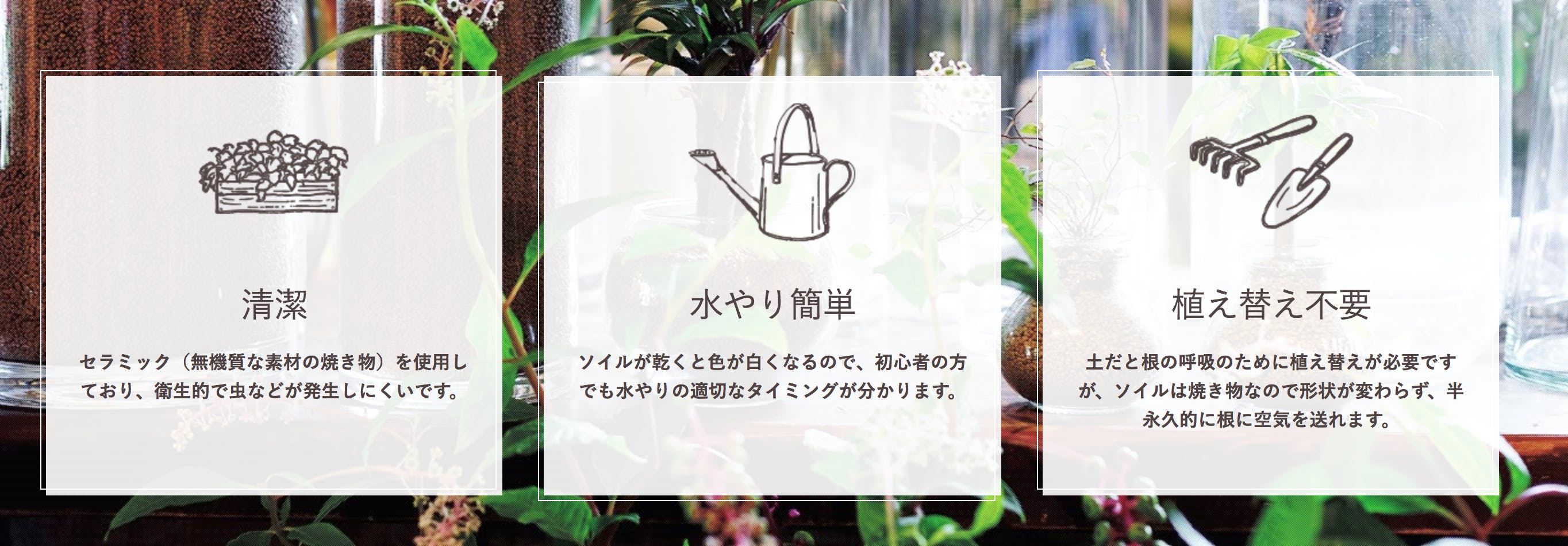 〈 植え替え不要 〉 土だと根の呼吸のために植え替えが必要ですが、ソイルは焼き物なので形状が変わらず、半永久的に根に空気を送れます。