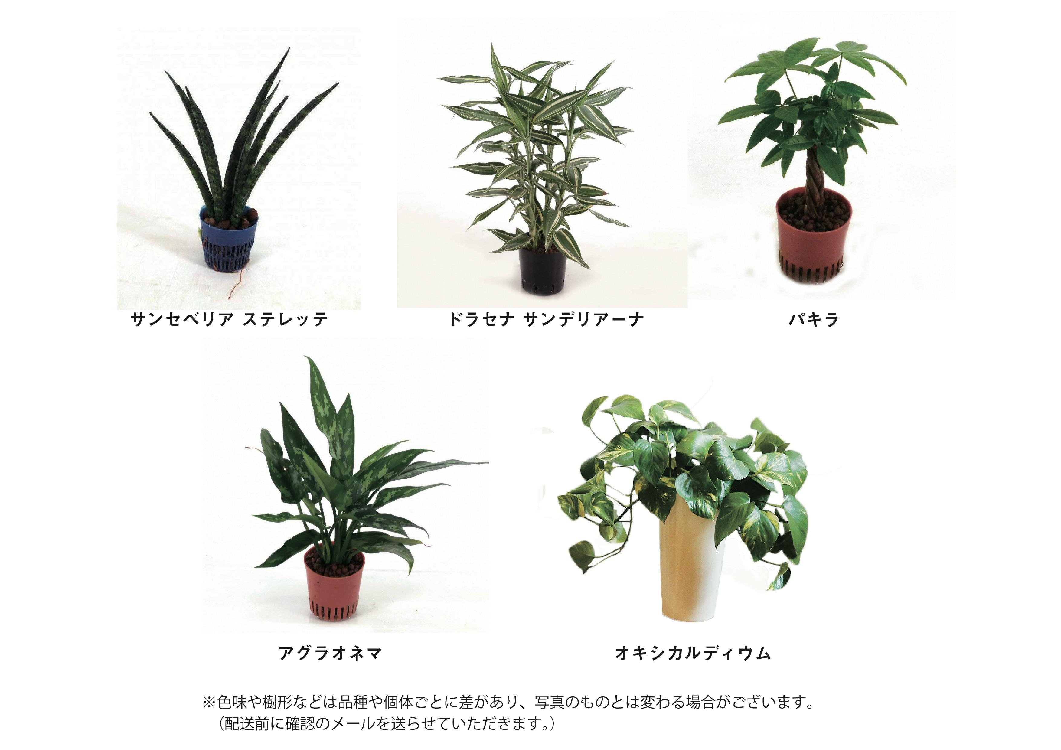 種類_パキラ/アグラオネマ シルバークイーン/オキシカルディウム/サンセベリア ステレッテ/ドラセナ サンデリアーナ