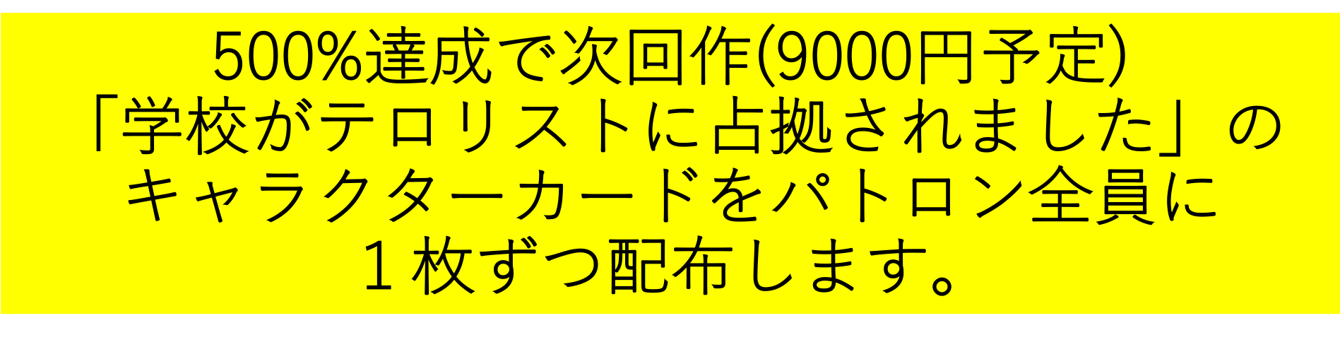 次回作の中量級ボードゲーム「学校がテロリストに占拠されました」のテストプレイ版のキャラクターカード(名刺印刷)をパトロン全員に配布いたします。