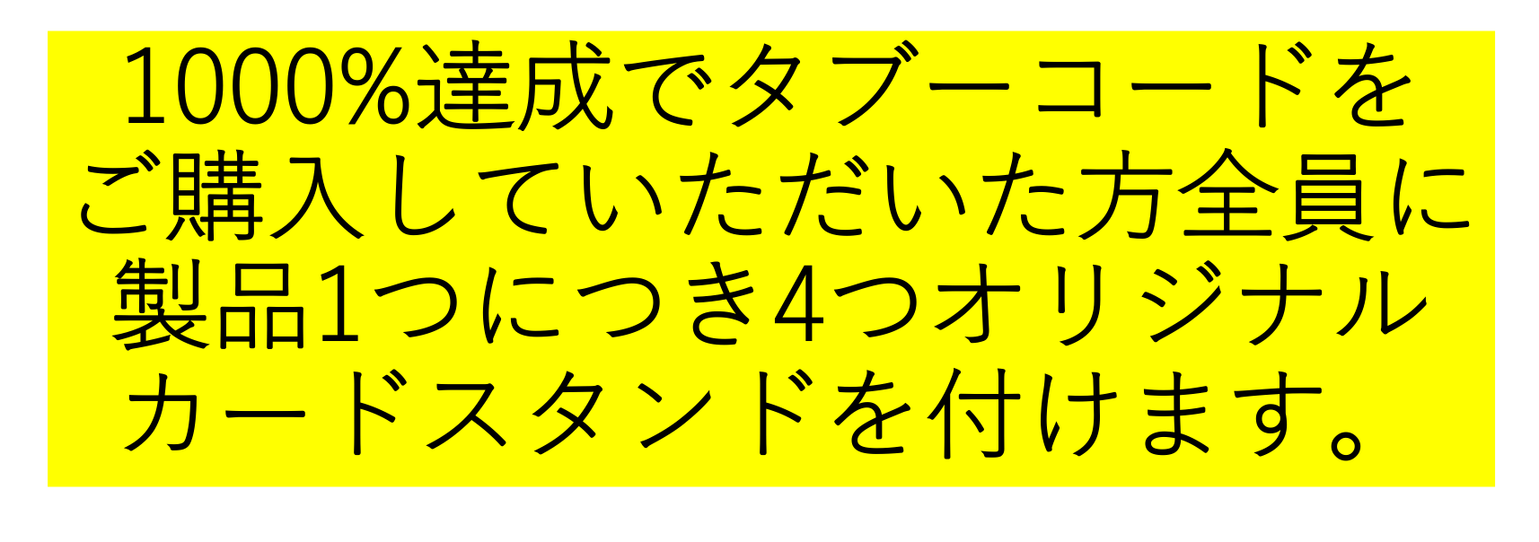 クラウドファンディング 1000%達成でタブーコードをご購入いただいた方全員に製品一つにつき4つオリジナルカードスタンドを付けます!宣伝の協力よろしくお願い致します!