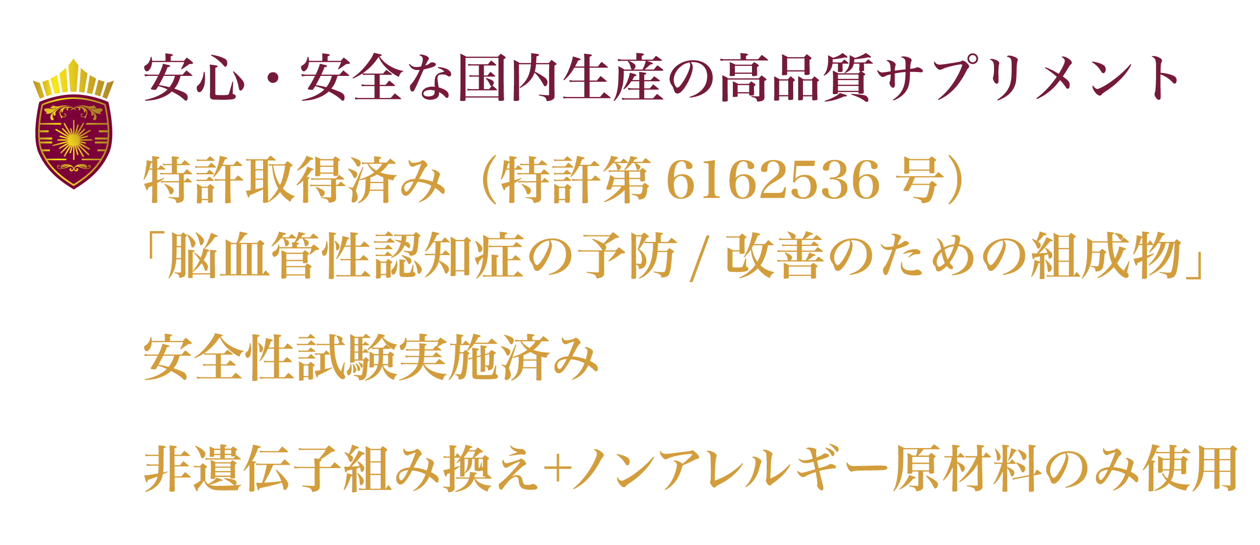 さらに「脳血管性認知症の予防/改善のための組成物」として特許取得済み(特許第6162536号)・安全性試験実施済み・非遺伝子組み換え+ノンアレルギー原材料のみを使用など、安心・安全という観点でも高品質な製品になりますので、老若男女問わずどなた様でも安心してご使用いただけます。