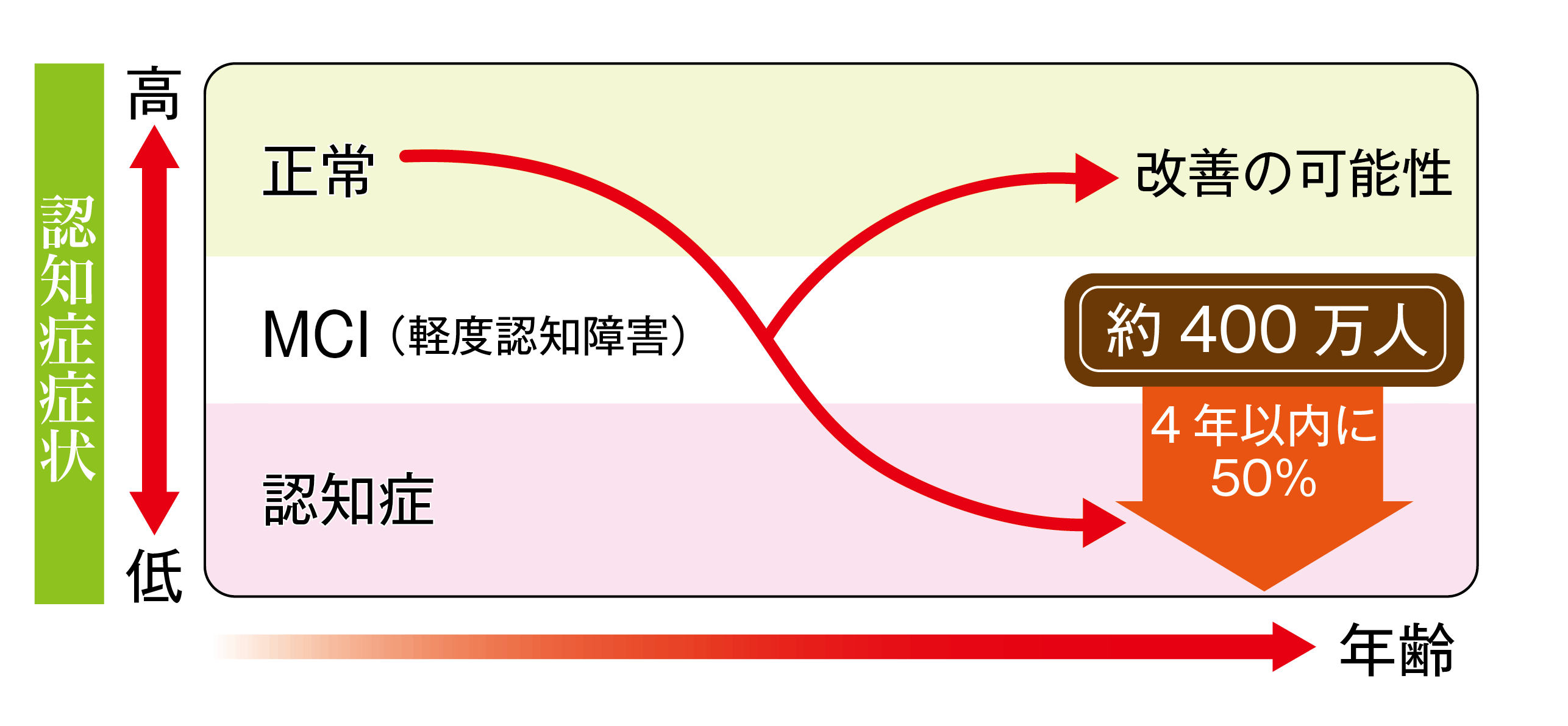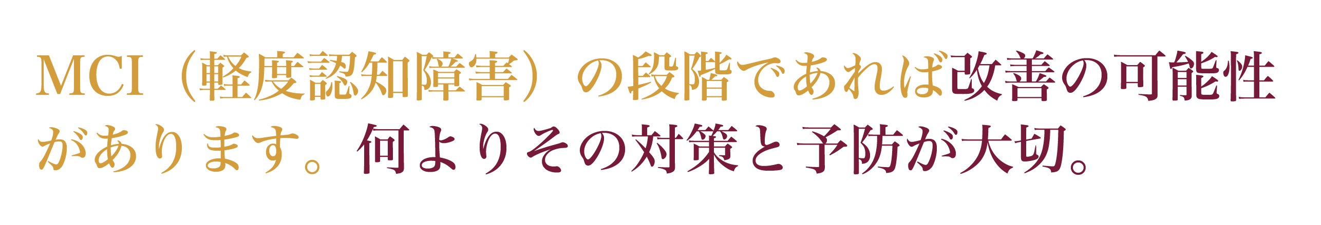 超高齢社会と言われる現在、65歳以上の高齢者の4人に1人は軽度認知障害(MCI)もしくは認知症であると言われています。中でも軽度認知障害(MCI)は約400万人もいるとされ、4年以内にその約50%は認知症へ進行いたします。