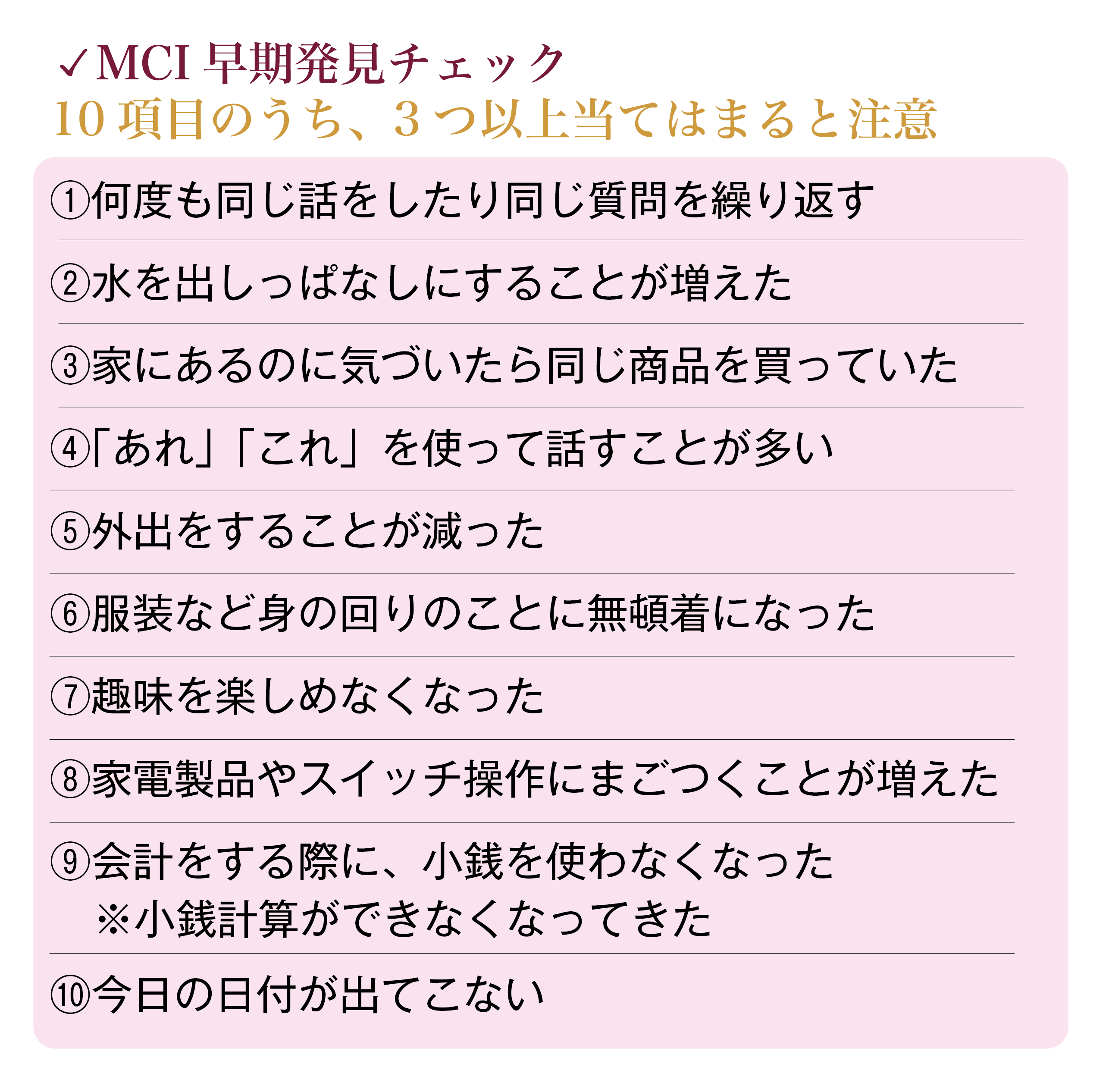 軽度認知障害(MCI)は「認知症の一歩手前」と言われる状態です。例えば、約束自体を忘れてしまうのが「認知症」、人に言われたり、メモを見て思い出すのが「軽度認知障害(MCI)」です。