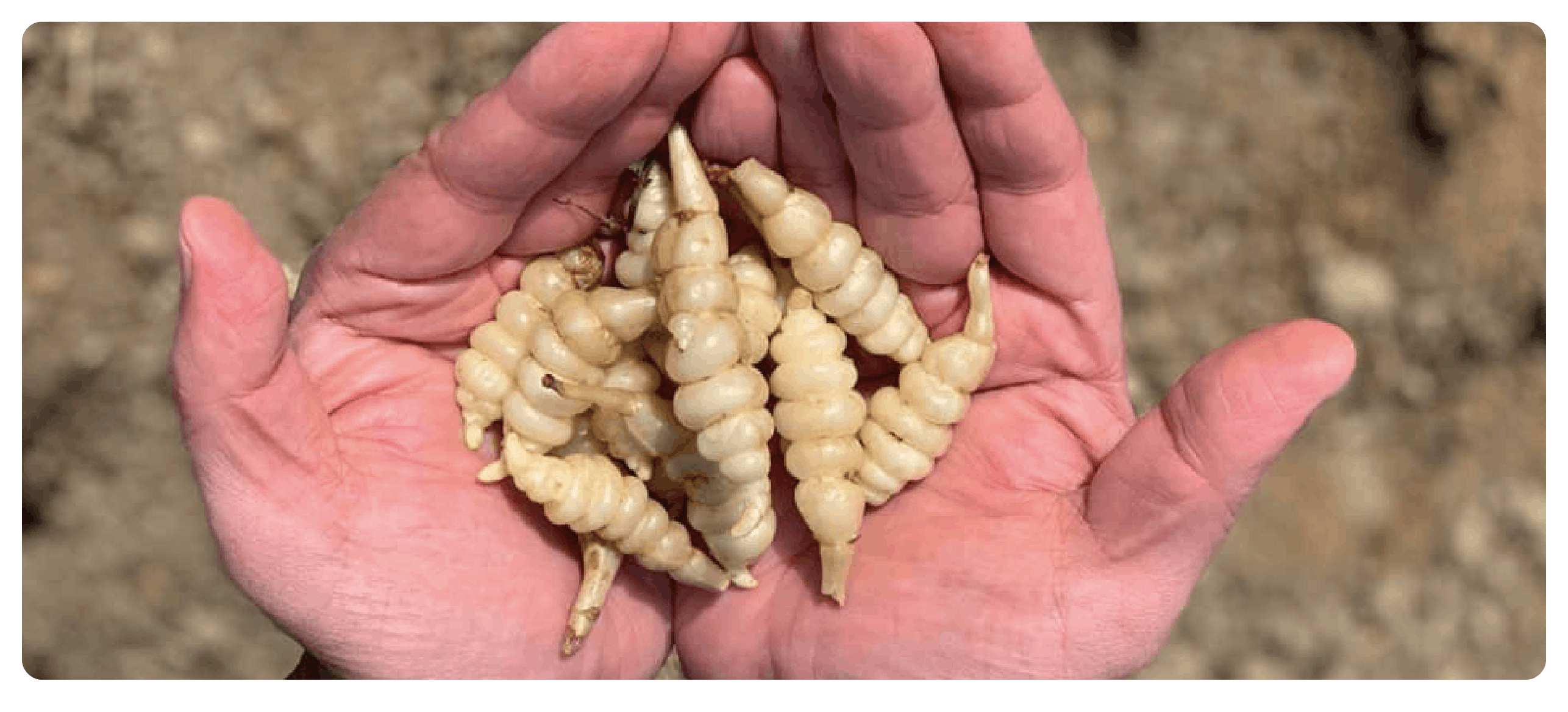 日本の食卓でもその特徴的な形とともに親しまれており、この塊茎を塩漬けにしたり茹でたりして食べます。食感はユリ根に似て、味は生姜のようにピリッと辛い味がします。