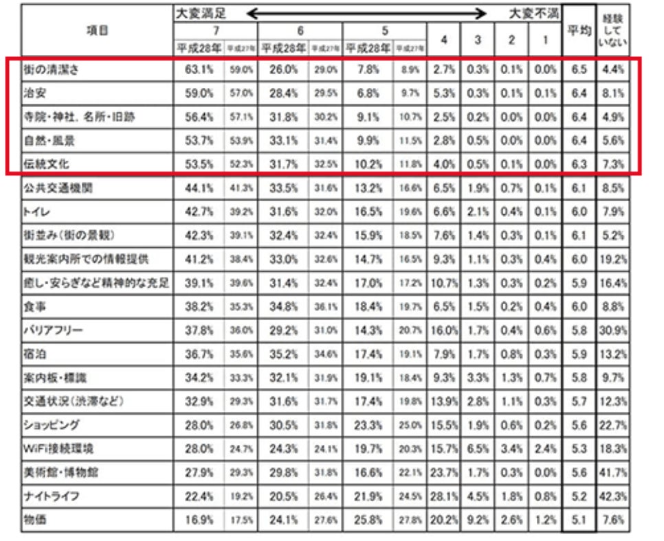 日本を訪れた外国人が日本に対して満足した項目の上位を見ると、清潔さや治安と並び、名所や自然、伝統文化といった項目が上位に来ています。