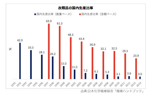 金額ベースでもアパレルの国内生産比率は、20年前の60%から20%に減少しています。