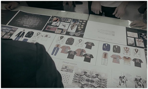 ファッションデザイン学科 高度専門士・ファッションデザイン学科・ファッション技術学科の計200名の学生にデザイン画を描いていただき、一次選考を通過した30名を選抜。最終的に13名のデザインを2019年SSのモノづくりに採用し、現在制作を行っています。