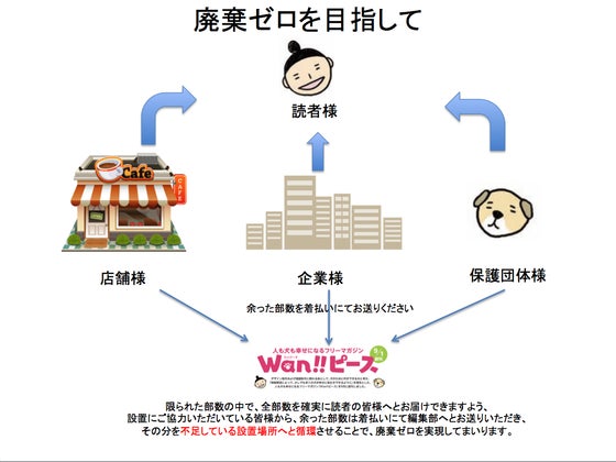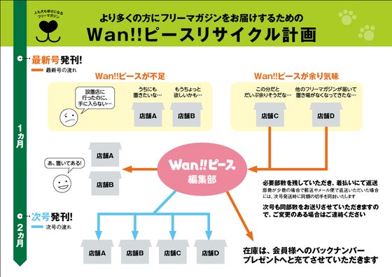 皆様、こんにちは。 編集制作スタッフのYです。 創刊号の発行から1ヶ月が経ちました。 大変ありがたいことに、本日時点で、 4,500[部]の99[%]を、 皆様の元へとお送りすることができました。 「Wan!!ピース」編集部では、 余った部数を編集部へと着払いにて お送りいただくシステムを構築できればと思います。 その分を不足している設置場所へと 循環させることで、全部数を読者の皆様へと お届けして、廃棄ゼロを実現してまいります。 ※まだラフの状態ではありますが、 イメージ図をアップさせてください。