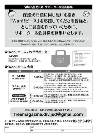 みなさま、こんにちは。 ご無沙汰してます、スタッフOです。 このたび「Wan!!ピース」では、 「サポーター&個人会員様」を 募集させていただきます。 第1号~第3号の印刷資金につきましては、 CAMPFIRE様にて資金調達してまいりました。 そして、来年以降の第4号以降も、 何としても「Wan!!ピース」を発行し続けるため、 想いだけではなく、仕組みの構築が急務と考え、 このたび皆様のご支援を募ることといたしました。 (詳細は添付フライヤーをご参照ください) 今後も保護犬問題を知っていただくきっかけ、 そして、皆様の想いを詰め込んだ フリーマガジン「Wan!!ピース」を制作してまいりますので、 皆様、何卒よろしくお願い申し上げます。