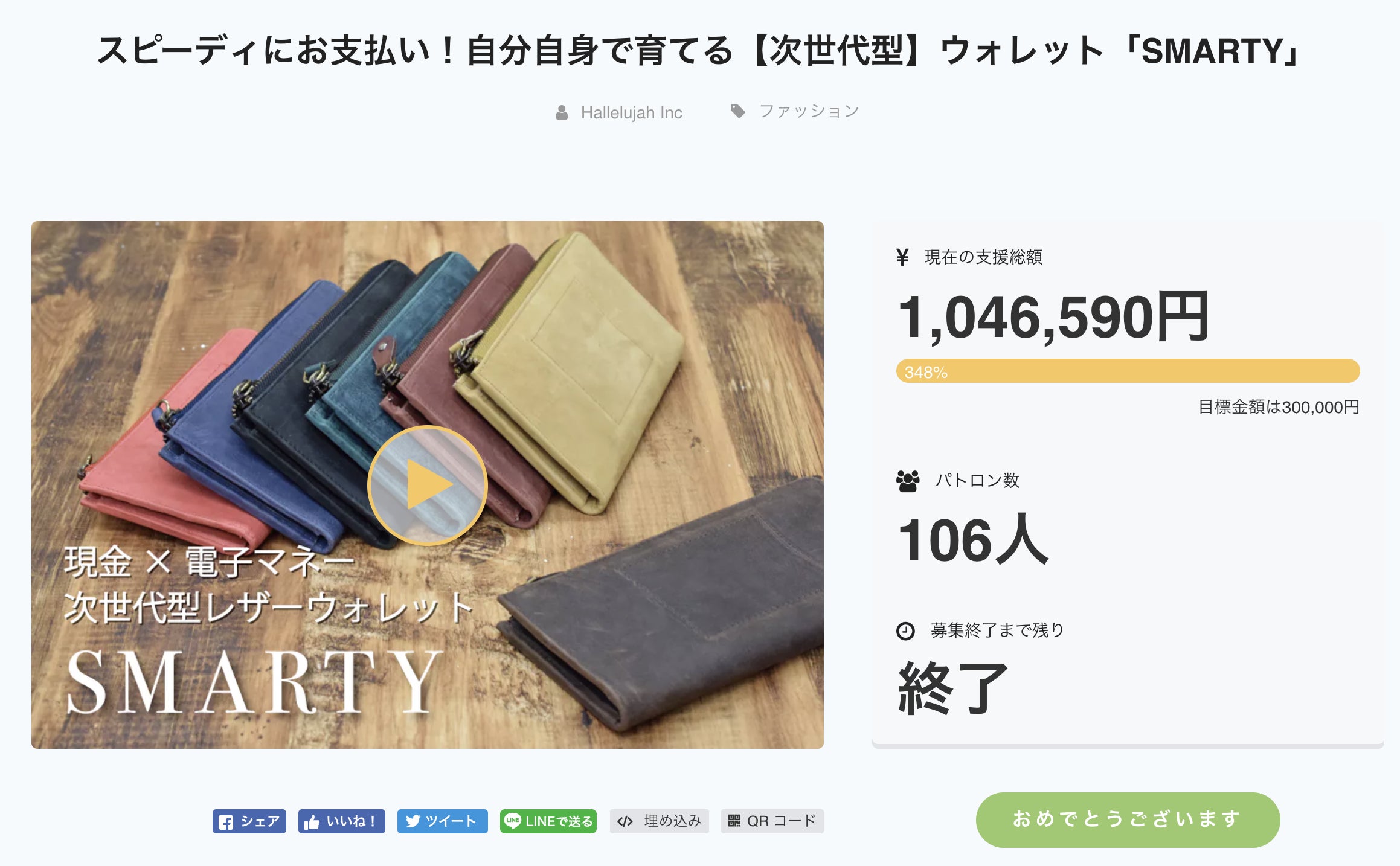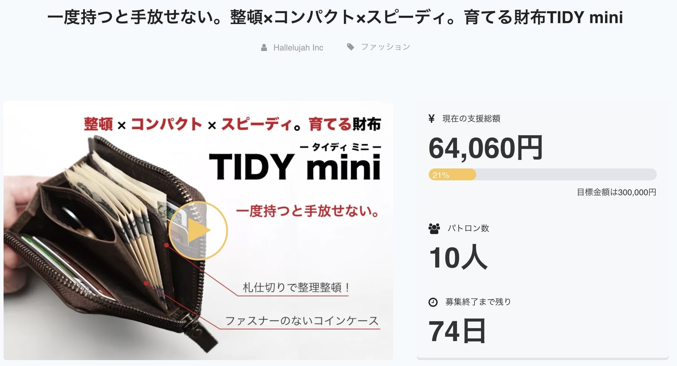 おかげさまで、第一弾TIDYに引き続き、第二弾SMARTYも目標金額を大幅に達成することができました。パトロンの皆様、本当にありがとうございました!また、現在、SMARTYの出荷準備も進めており、早ければ、今週中に全ての発送を完了させていただく予定です。==================3/15より、予定より少し早くなってしまいましたが、Makuakeプロジェクト第三弾がスタートしました!!今回のプロジェクトは、一度持つと手放せない。整頓×コンパクト×スピーディ。育てる財布TIDY minihttps://camp-fire.jp/projects/view/140011TIDY miniは、過去二つのプロジェクト第一弾 「育てる整理整頓長財布 TIDY」と第二弾 「スピーディにお支払い次世代型ウォレットSMARTY」でご支援頂いた皆様のお声から完成した作品です。関わっていただいた多くの方々に、大変感謝致します。頂いたたくさんのご意見をもとに、もっと使いやすいお財布を作ることはできないか、もっと満足してもらいたい・・・!と改めてスタッフ一同、アイデアを出し合い、試行錯誤を重ね、ようやく完成しました。【第一弾】TIDYに備わった「整理整頓」【第二弾】SMARTYに備わった「スピーディにお支払い」そして、持ちやすさを重視した「コンパクトなサイズ感」を兼ね備えた財布、それが『TIDY mini』。ぜひ、一度ご覧いただけますと幸いです。