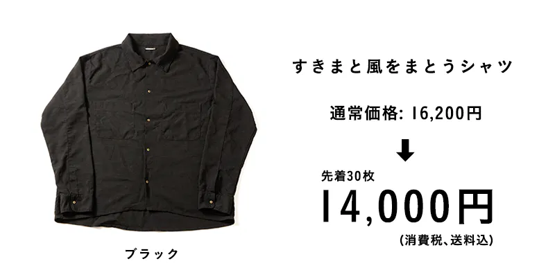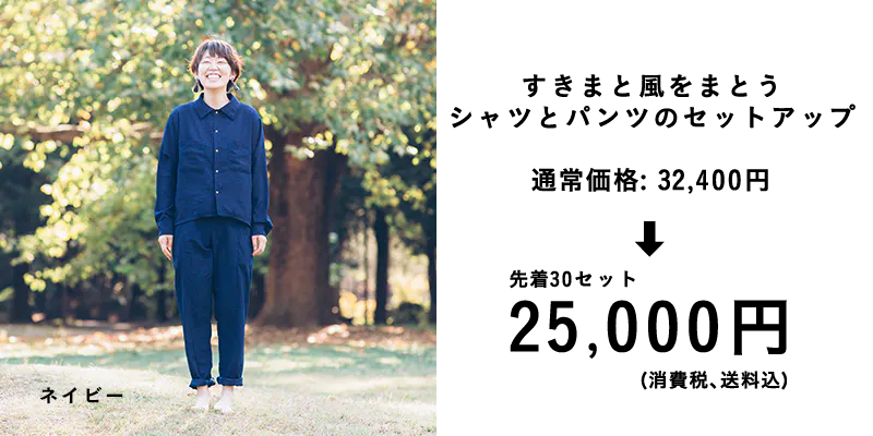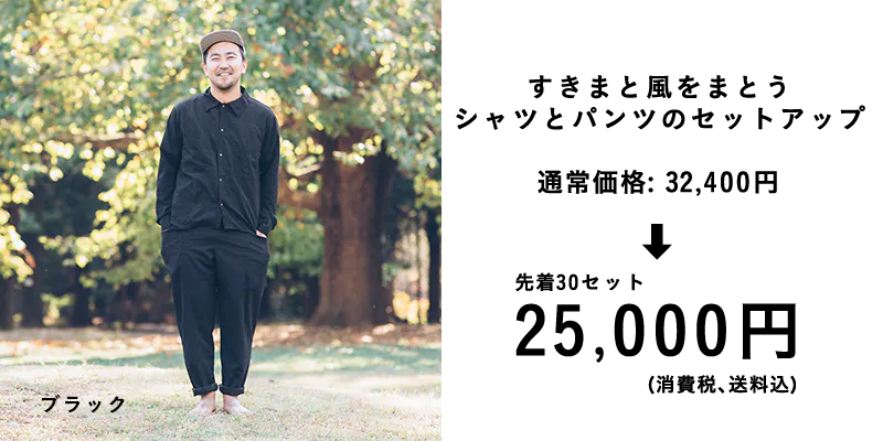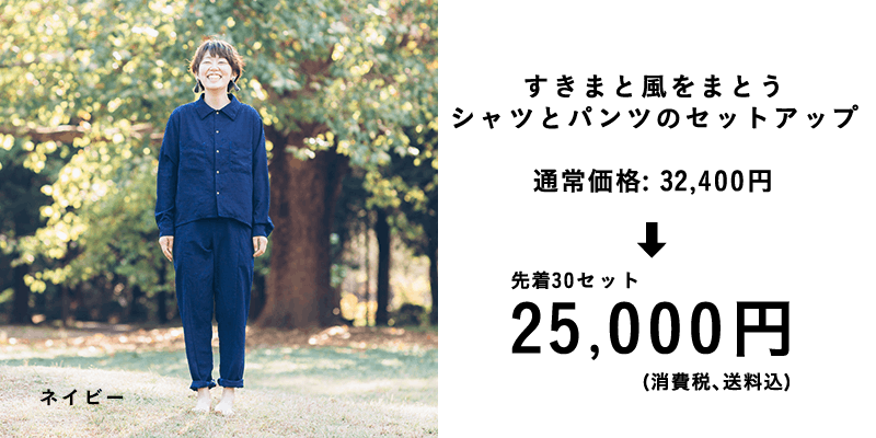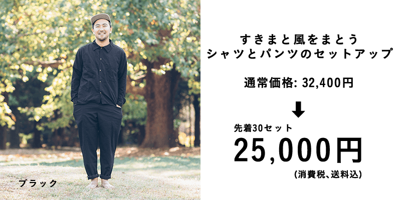 今回の商品は、暖かい季節に着てほしい『すきまと風をまとう服』です。リターンのお届けは、元号が変わる直前の2019年4月の予定です。(少し製造に時間がかかってしまいます。。すみません!)