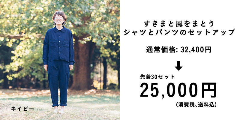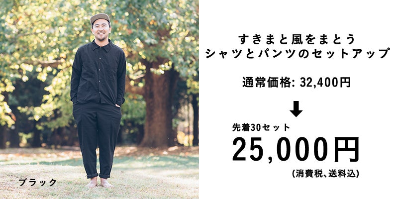 今回の商品は、暖かい季節に着てほしい『すきまと風をまとう服』です。リターンのお届けは、元号が変わる直前の2019年4月の予定です。(少し製造に時間がかかってしまいます。。すみません!)