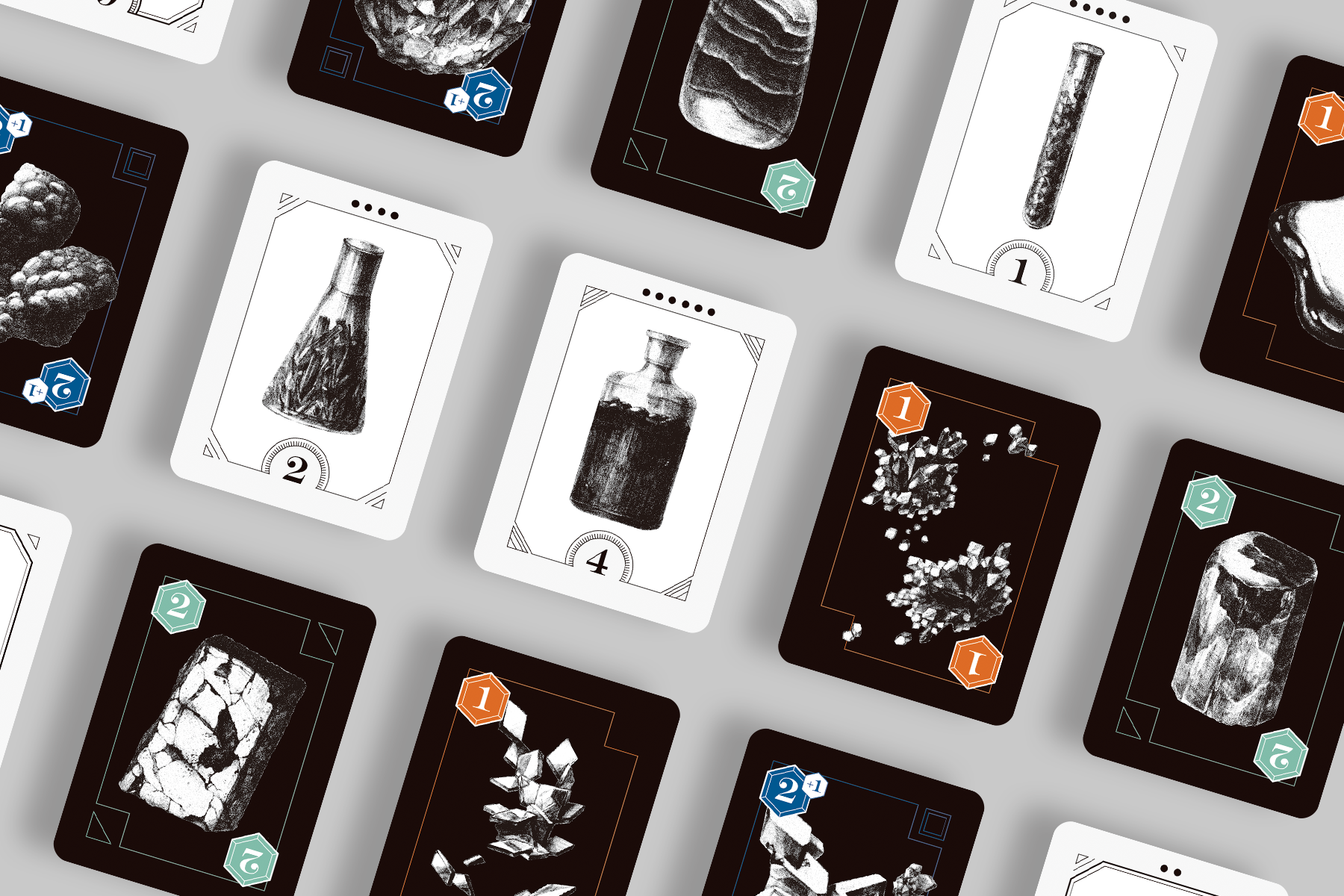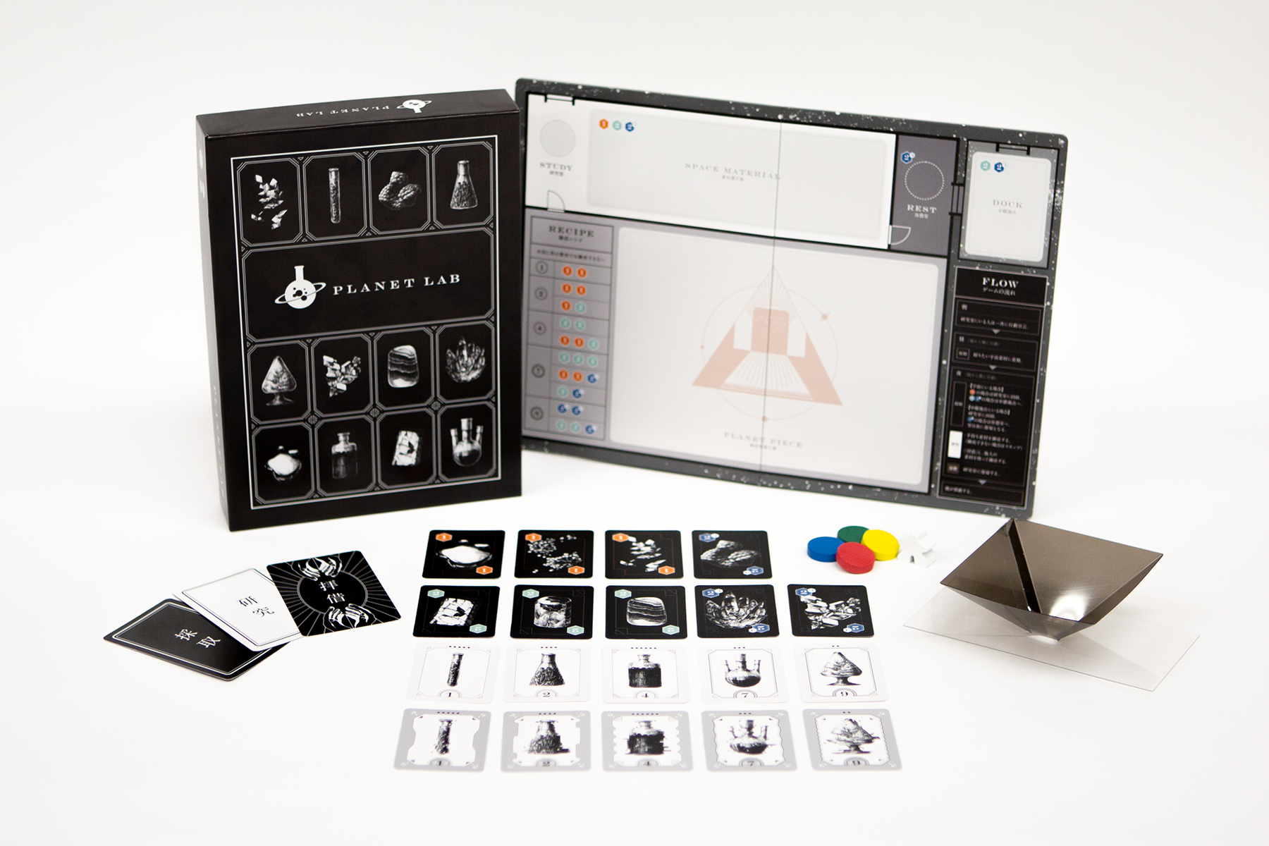 「PLANET LAB」は、「最も寿命の長い惑星」を作り出すことを目指す、4人プレイ専用ボードゲームです。プレイヤーは研究職員として<素材カードの採取>と<素材カードの研究>を繰り返し、惑星の材料となる「錬成物カード」を集めていきます。(上記画像はセットの一部です)