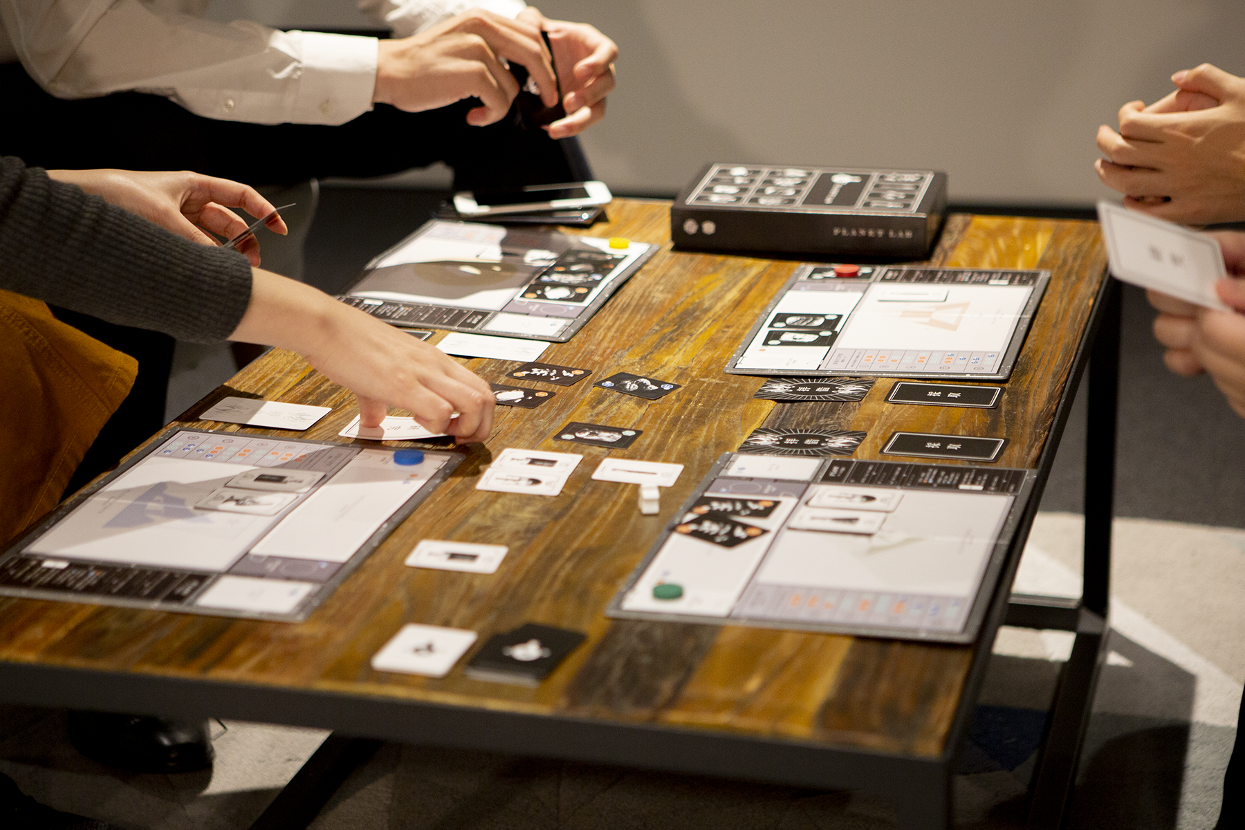 2017年春から開発をスタート。半年かけてゲームデザインを行い、2017年秋のゲームマーケットにて、試作版を試遊できるブースとして初出展。プレイいただいた皆さまから大好評をいただきました。