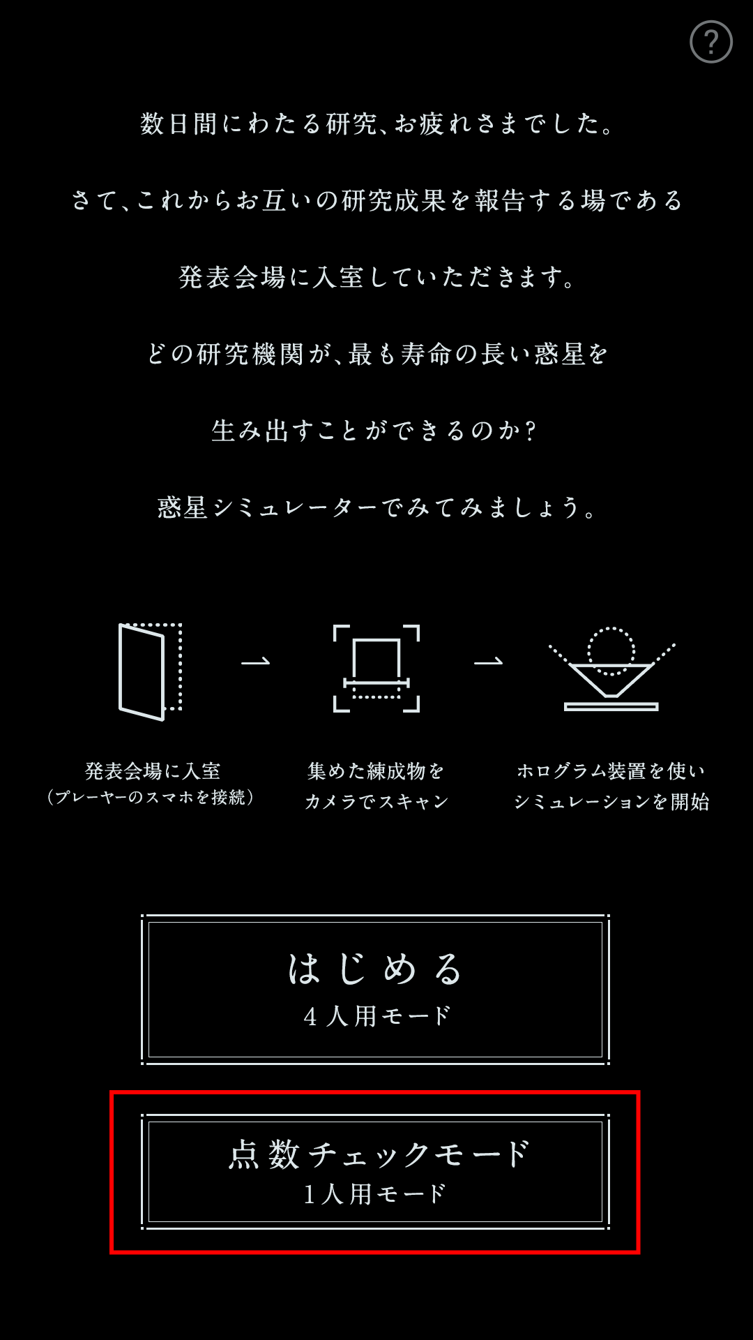 2019/05/14 14:02こんにちは、HACKist_(ハックイスト・アンダー)です。 「PLANET LAB」アプリアップデートのお知らせです!多数のご要望をいただいておりました、「一人用モード」の追加を行いました! スマートフォン4台を接続することなく、点数計算と惑星シミュレートができるようになりました。 (その代わり、順位が出ない、惑星の爆発タイミングが同時になってしまう、といったデメリットはございます)「どうしても4台が繋がらなくて先に進めない!」 「惑星だけをシミュレートしてみたい!」 といった場合に、ぜひご活用ください。 その他、惑星追加やバグ修正などのアップデートを行なっております。 詳細は以下ゲームマーケットブログにまとめております。■アプリアップデートのお知らせアプリの接続に不具合が出る場合は、以下をご確認ください。■アプリ動作につきましてその他ご質問事項については、HACKist_Twitterアカウントへダイレクトメッセージをお願いいたします。 それでは引き続き、「PLANET LAB」をお楽しみください。 もっと見る