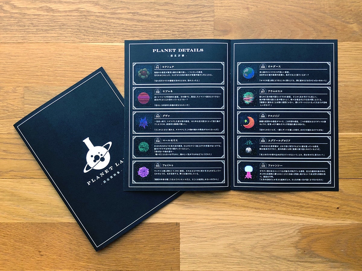 ゲームのシナリオ背景や、登場する素材・惑星の解説がびっしりてんこ盛りの1冊となっております。特に、ゲーム内に登場する全20種にも及ぶ惑星の解説は必見。ぜひ、お手元に届きますゲーム本体で全ての惑星を作成してみてくださいね。