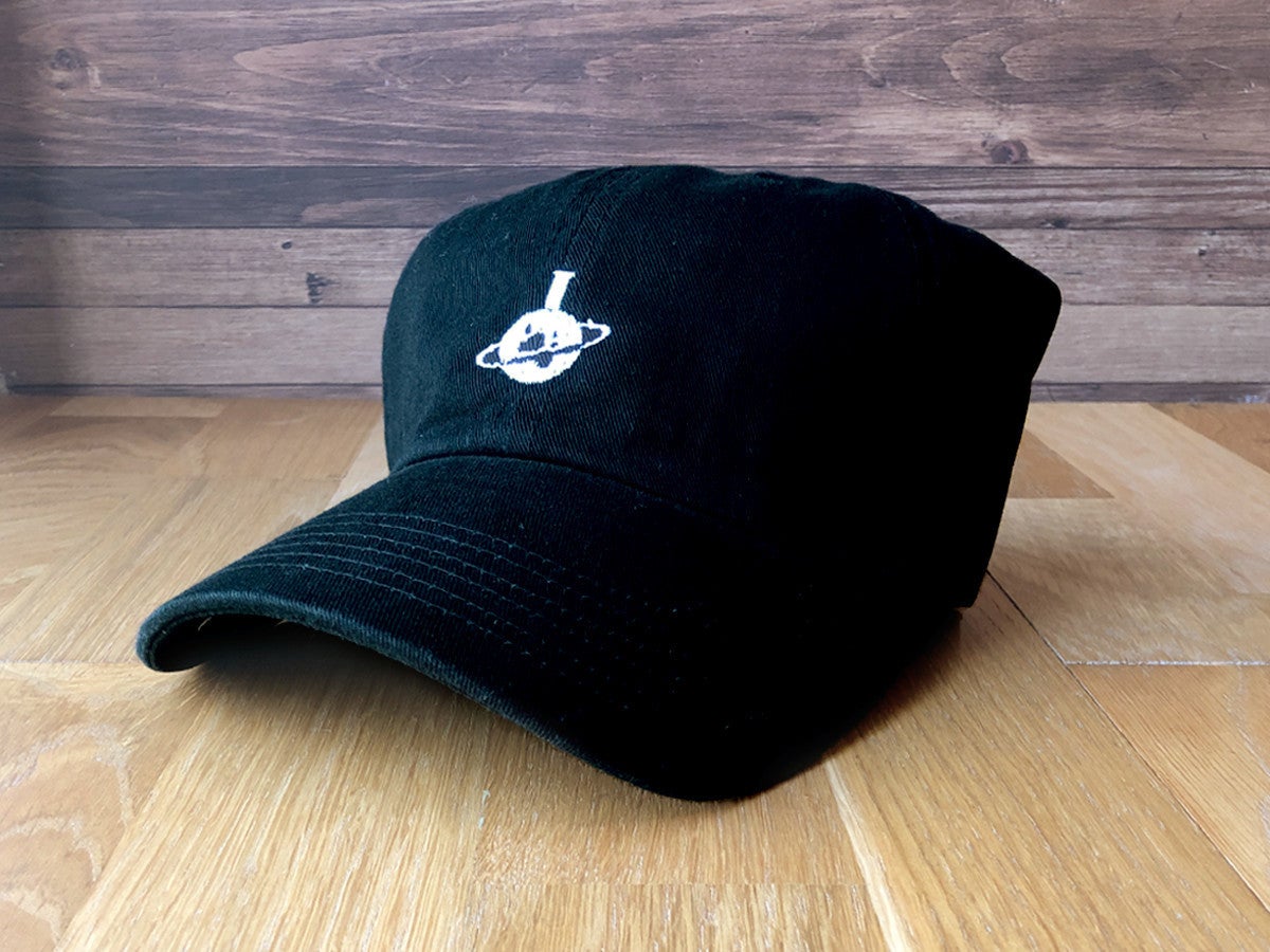 綿100%のコットン生地に白糸でゲームロゴを刺繍しました。背面は金具でサイズ調節可能で、全体にちょっとヴィンテージな風合いがあります。どんなスタイルにも合わせやすいキャップだと思います。