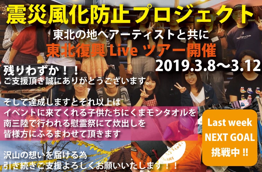 今回も、東北の地へ東京からアーティストと一緒に行き、身を置いて、肌で触れ、感じてもらい、アーティストたちが日頃行っているライブや、想いをつづるSNSで現状を発信し、東日本大震災の風化防止と防災意識の重要性を認識して頂くことを目的とし東北音楽ツアーを開催します。現地・東北のアーティストとの交流も行い、それぞれが他人事を自分事に感じ寄り添えるような関係構築、またツアー後も継続してアーティストたちを支援し、つながりをより厚くしていきたいと思っています。
