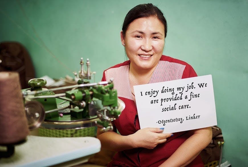 何世紀にもわたる遊牧民の生活様式を通じて、モンゴルでは厳しい気候に適応したカシミヤヤギ、ヤク、キャメルの柔らかく暖かいニット製品を生み出しました。家畜たちはすべてオーガニックの牧草で大切に育てられます。生産を委託するモンゴルの工場は、ある一人のモンゴル人女性が仲間たちと一緒に設立しました。女性の雇用に重点を置き、家畜から得た原毛が主な収入源となる牧畜業者に対し、適正な価格設定を行い遊牧民たちの生計の安定を支援しています。その製造プロセスでは、糸を1ビットごとにリサイクルして1%の無駄も出さないそうです。暖かく、軽く、素晴らしい肌触りのニット製品をぜひお届けしたいと考えています。