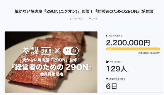 2016/10/31 14:5810/18に募集を開始し、215名の方のご支援により3,766,000円の資金を集めることができました! プロジェクト無事に目標達成で終了致しました!ご支援頂いた皆様、本当にありがとうございました。 10/18に募集を開始した『経営者のための29ON(ニクオン)』。 最終的に215名の方のご支援により3,766,000円の資金を集めることができました。 経営者の方や経営者の方を目指す方に何かできることはないか、そう思い、スタートさせた今回のプロジェクト。当初は本当に支援を集められるのかどうか不安に思う部分もありました。 しかし、終わってみると当初の目標はもちろんのこと、ストレッチゴールまで達成することができました。正直驚きと同時に感激しております。 これもひとえにご支援してくださった皆様のおかげです。ご支援頂いた皆様本当にありがとうございました。(今回のチャレンジで得たクラウドファンディングのノウハウは、支援者の皆様に全開示いたしますので、こちらも楽しみにしてください。) とはいえ、クラウドファンディングでの成功は『経営者のための29ON』オープンのための1歩にすぎません! 早速本日から、店舗の改装やメニューの作り込みなど、オープンに向けた準備を開始しております。ビジネスの交流もできる他にはない一風変わったお店を創り上げますので、ぜひご期待ください! また、お店のオープン日や『クラウドファンディングのノウハウセミナー』の日程は確定次第すぐに皆様にメッセージにてご報告させていただきますので、もうしばらくお待ちいただけますと幸いです。ご不明な点などございましたらキャンプファイヤーのメッセージ経由、もしくは参謀Facebookページ(https://www.facebook.com/ksanbou.jp/?fref=ts)の方にお問い合わせお願い致します。 最高の肉体験とビジネスの出会い、どちらも楽しめるお店がつくれるよう今後も尽力していきます。 温かいご支援の程どうぞよろしくお願いいたします。 株式会社経営参謀 代表 新谷健司 もっと見る【先着20名限定】『経営者のための29ON』先行試食会開催が決定しました。