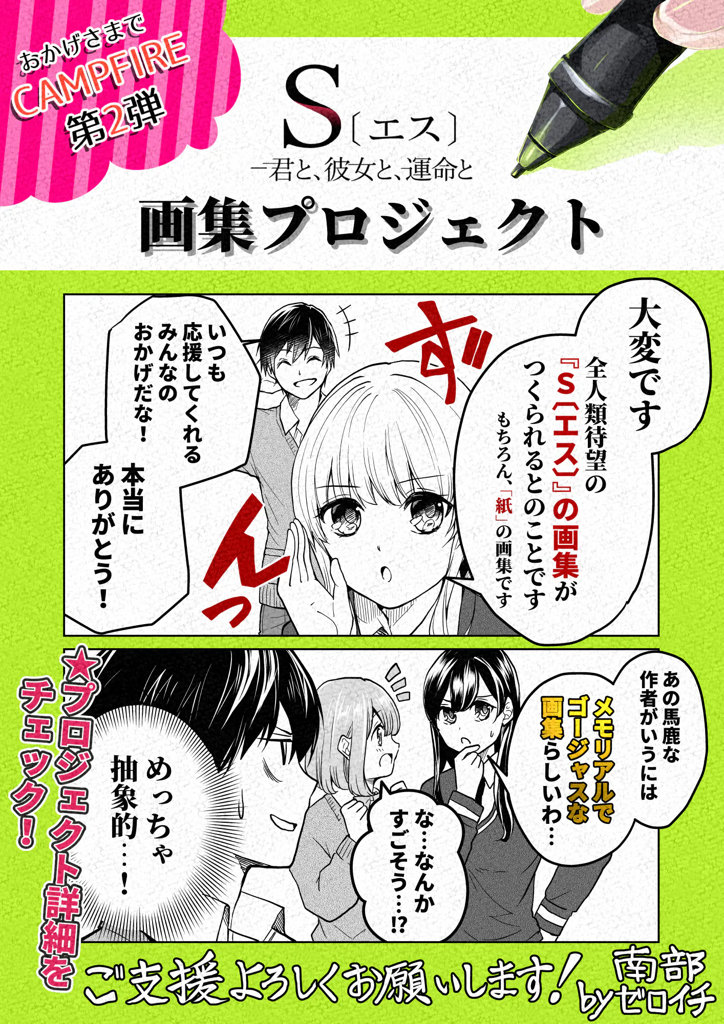 この度は、このような機会を用意させていただきましたことを『S〔エス〕 -君と、彼女と、運命と』読者の皆様、GANMA!ユーザーの皆様に感謝申し上げます。今回の企画につきましては、これまでの物と比較してできるだけ参加可能金額を抑えることができましたが代わりに目標金額が大きくなっており、画集コースのみで考えると600冊相当、と多くのご支持を必要となっております。是非、南部ゼロイチ先生の美しくて、可愛くて、カッコいいイラストの数々を画集という形で表現できますよう、ご支援いただけますと幸いです。