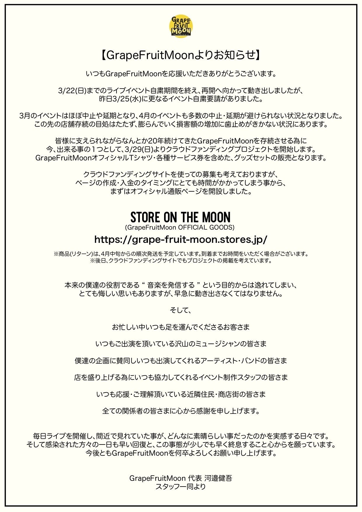 引き続き、三軒茶屋GrapeFruitMoonにご支援のほど宜しくお願い申し上げます。