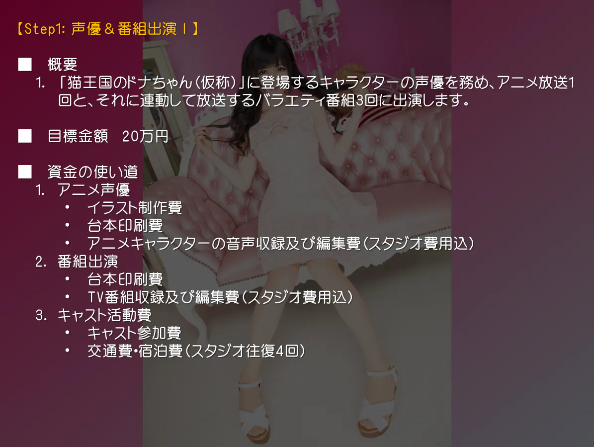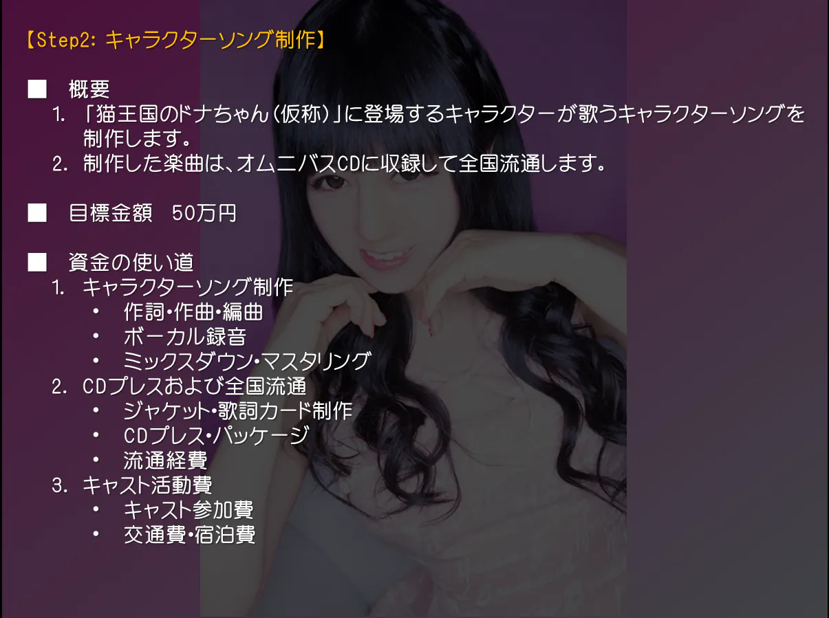 さて、プロジェクト運営チームでは、「藤咲もあ」の更なる成長と活躍を期待して、Step2の目標を設定させて頂きました。これを達成する事で、キャラソンの制作およびオムニバスCDへの収録、更には全国流通の報酬が確定します!!